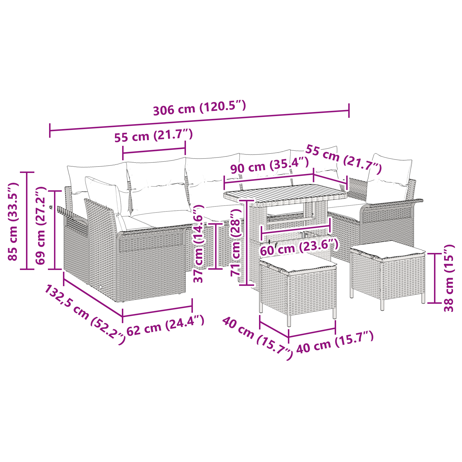 • Kompletní souprava Tato zahradní pohovka zahrnuje pohovky s opěrkami, střední lavici, stoličky a stůl, což dává plynulé uspořádání pro sezení a pohodlí. Odnímatelné sedáky na zip usnadňují údržbu a zajišťují komfort během používání.