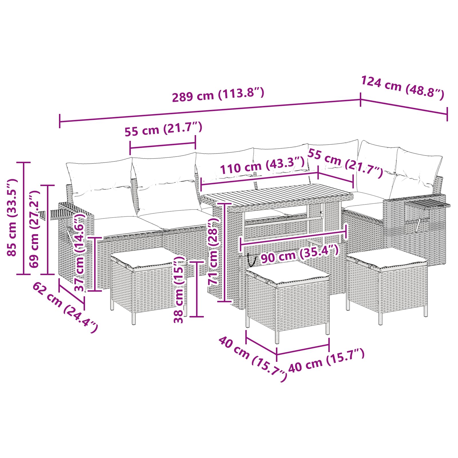 Tato elegantní modulární zahradní pohovka spojuje pohodlí a všestrannost pro váš venkovní prostor. Její moderní design se skvěle hodí k různým styly zahrady, přičemž poskytuje prostor na setkání s rodinou a přáteli. Spojení přírodních materiálů s funkčním designem vytváří příjemné místo pro sezení, které navozuje pocit nekonečného odpočinku a spokojenosti.