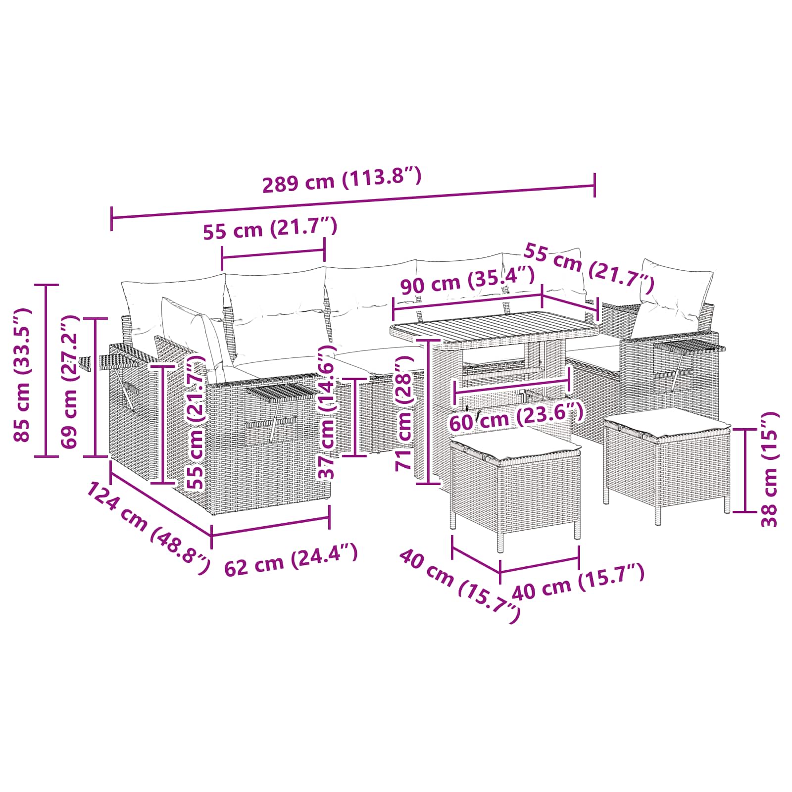 Tato modulární zahradní sofa set spojuje moderní styl s univerzální funkcionalitou, ideálně se hodí pro venkovní prostory jako zahrady a terasy. Jeho elegantní design neutrálně ladí s okolím a nabízí skvělou rovnováhu mezi stylem a pohodlím. Tento set můžete snadno přizpůsobit podle potřeby a vytvářet různá uspořádání pro každou příležitost či aktivitu. S jeho skvělou texturou a příjemnou přítomností se každý rád sejde s přáteli a rodinou a užije si volný čas v pohodlí.