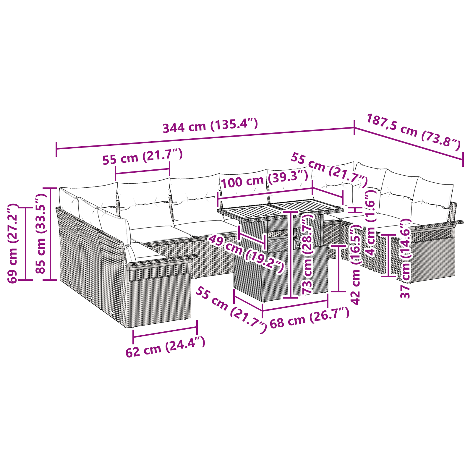 Tato modulární zahradní sedací souprava vnese do vašeho venkovního prostoru moderní styl a praktičnost. Je navržena tak, aby se přizpůsobila terasám a zahradám, a nabízí pohodlí jak pro společenské akce, tak pro soukromou relaxaci. S čistými liniemi a jednoduchým geometrickým designem působí elegantně a současně, což z ní dělá skvělý doplněk pro moderní venkovní styl. Představte si ji jako centrum zahradní párty, které vyzařuje pohostinnost a svádí k dlouhému odpočinku na slunci nebo ve stínu.