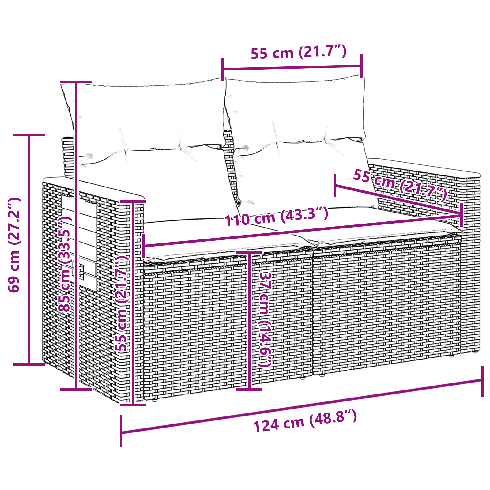Tato zahradní pohovka skvěle spojuje moderní design s funkčností, ideální pro každou venkovní obytnou plochu. Je navržená pro styl a pohodlí, její čisté linie a jednoduchý vzhled ji dělají ideálním středem pozornosti na terasách a zahradách. Tkaná struktura vytváří útulnou atmosféru, která je perfektní na lenošení nebo společenské akce.