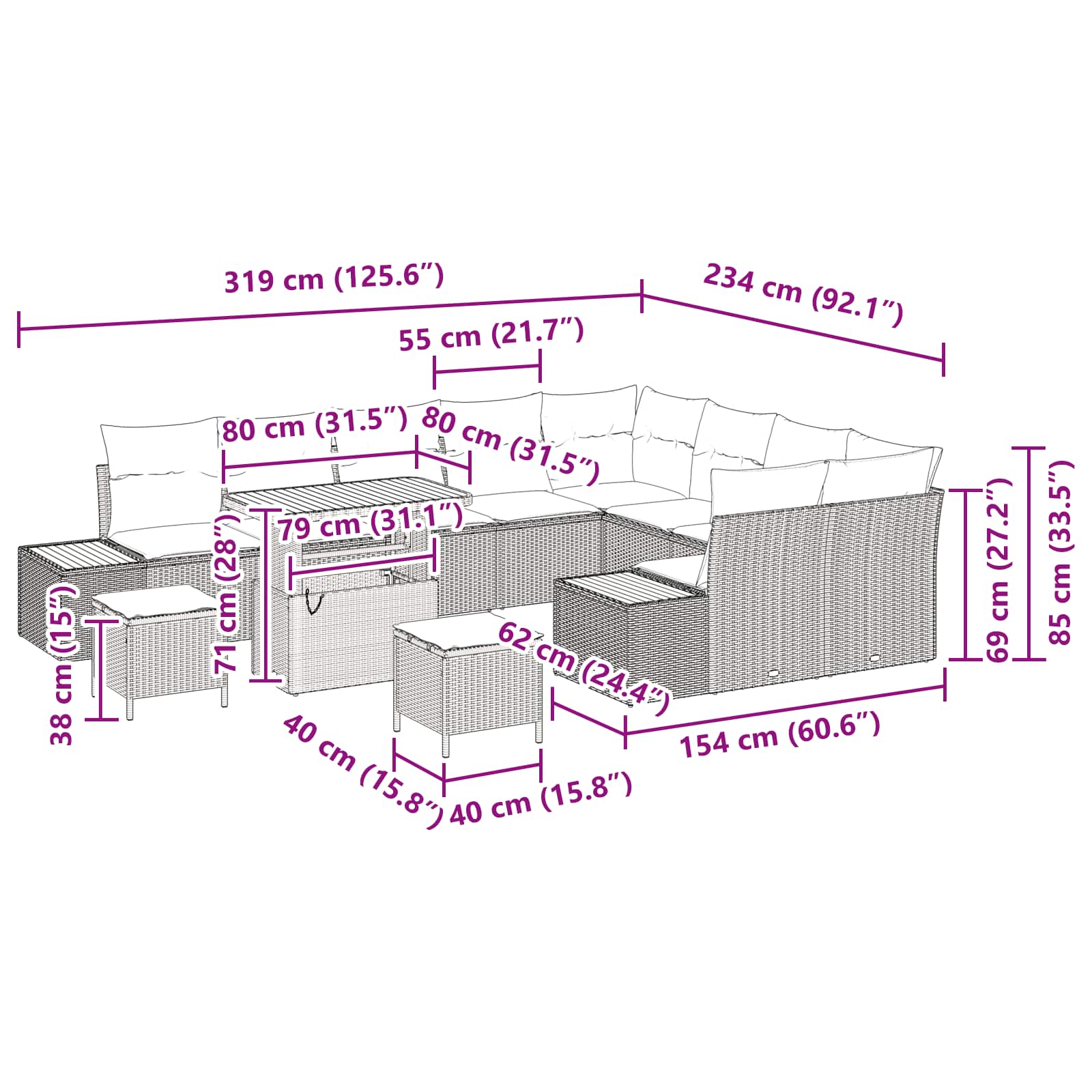 Tahle moderní zahradní pohovková souprava promění váš venkovní prostor na pohodlný a stylový ráj. S elegantními liniemi a funkčním designem je perfektní jak na lenošení, tak na zábavu. Konstrukce z poly ratanu nejen, že skvěle vypadá, ale zaručuje i odolnost, takže si můžete užívat víc prostoru pro rodinu a přátele na čerstvém vzduchu.