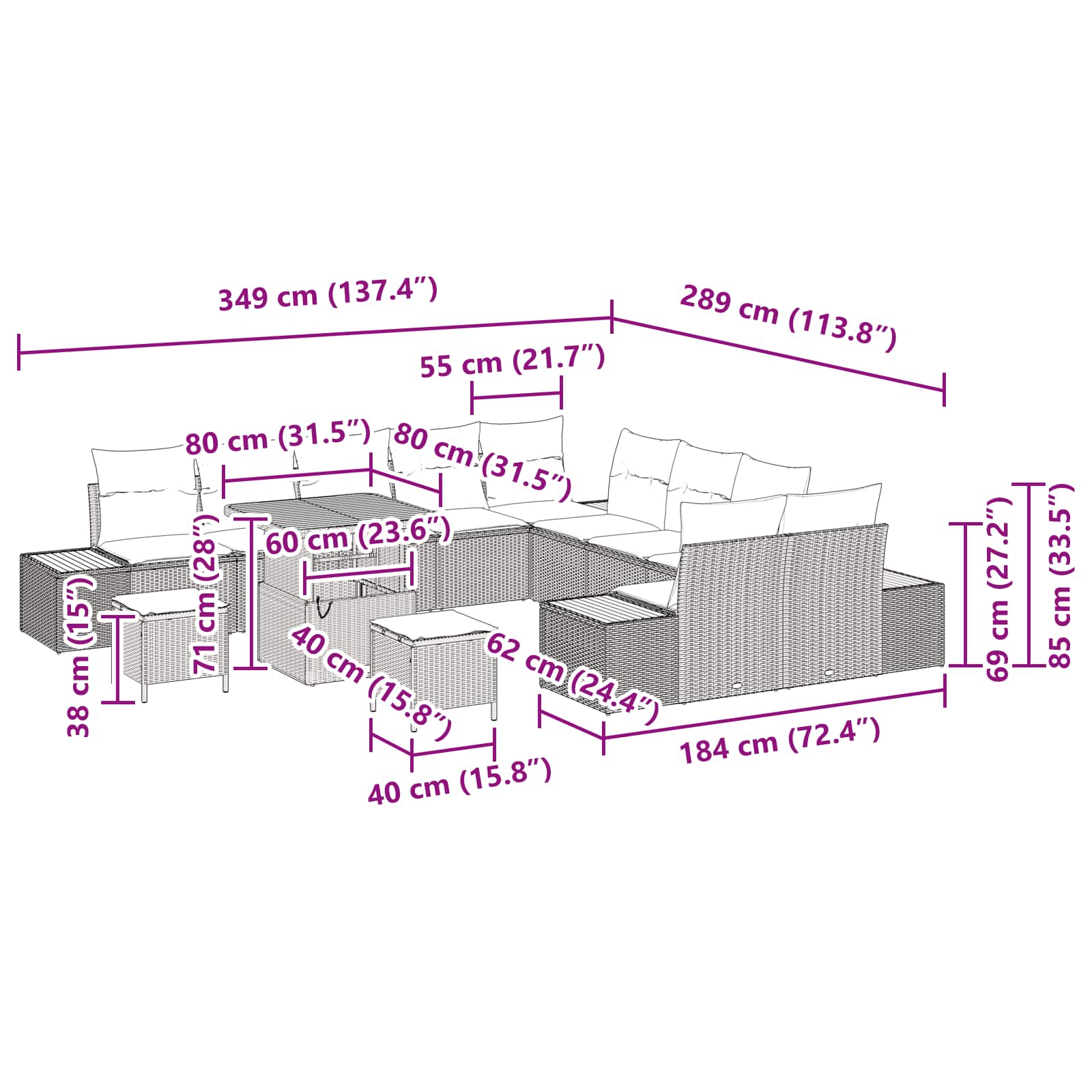 • 4 x Boční pohovka: 92 x 62 x 69 cm (D x Š x V)