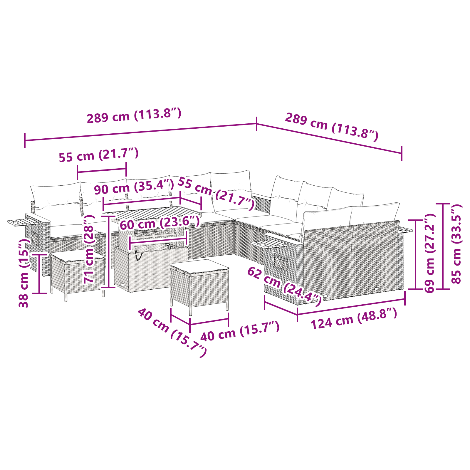 Tato zahradní souprava gauče má moderní šarm a skvěle se hodí na venkovní akce a posezení. Její elegantní linie a jednoduchý design promění každou zahradu nebo terasu na příjemné místo na sezení. Je ideální na jaro a léto, díky poly ratanu a práškově lakované oceli vypadá pořád skvěle a dává dostatek prostoru k sezení s pohodlnými odnímatelnými polštáři.