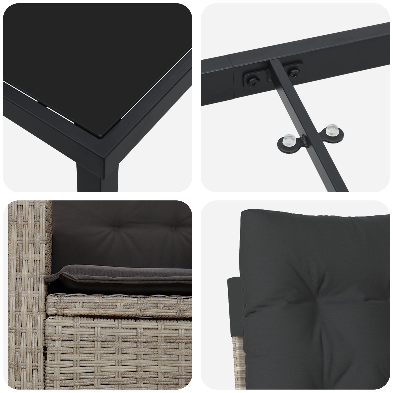 • Materiály: Set je vyrobený z poly ratanu a odolné oceli, zajišťující trvanlivost a eleganci. Poly ratan se přirozeně brání UV záření a špatnému počasí, takže je ideální na slunečné dny, a ocelový rám dodává pevnost a stabilitu pro dlouhodobé používání.