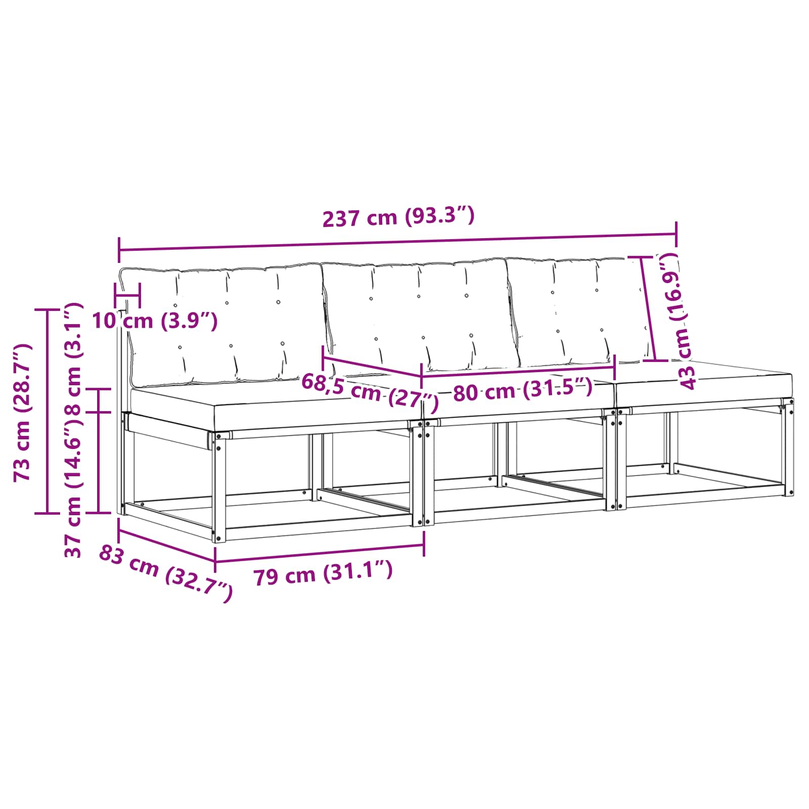 • 3 x Střední pohovka: 79 x 83 x 73 cm (DxŠxV)