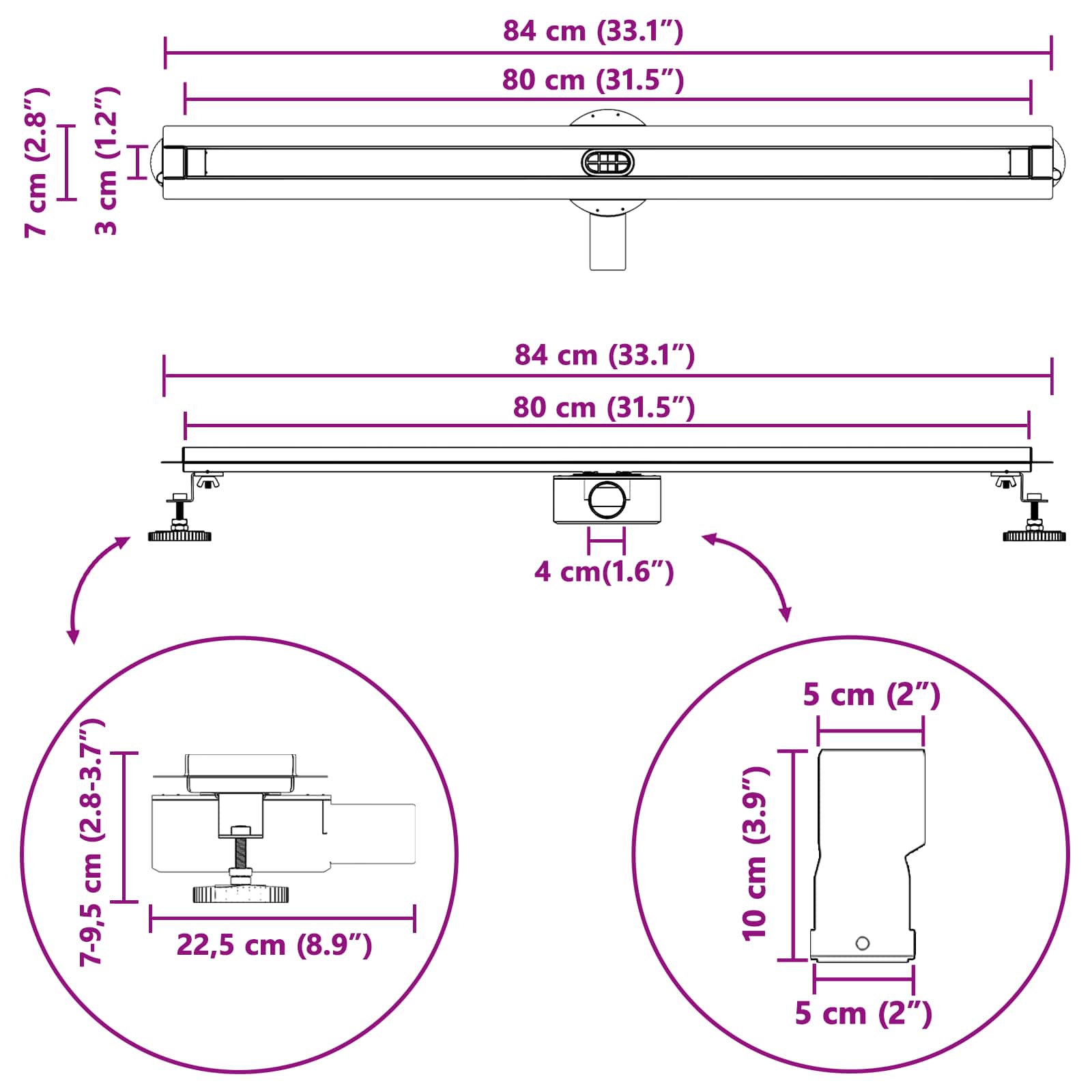• Robustní nerezová ocel: Odtok je vyroben z nerezové oceli, která je známá tím, že vydrží, a zajišťuje dlouhou životnost a elegantní vzhled. Tento materiál nejen dobře vypadá, ale je i hygienický pro vaši koupelnu.