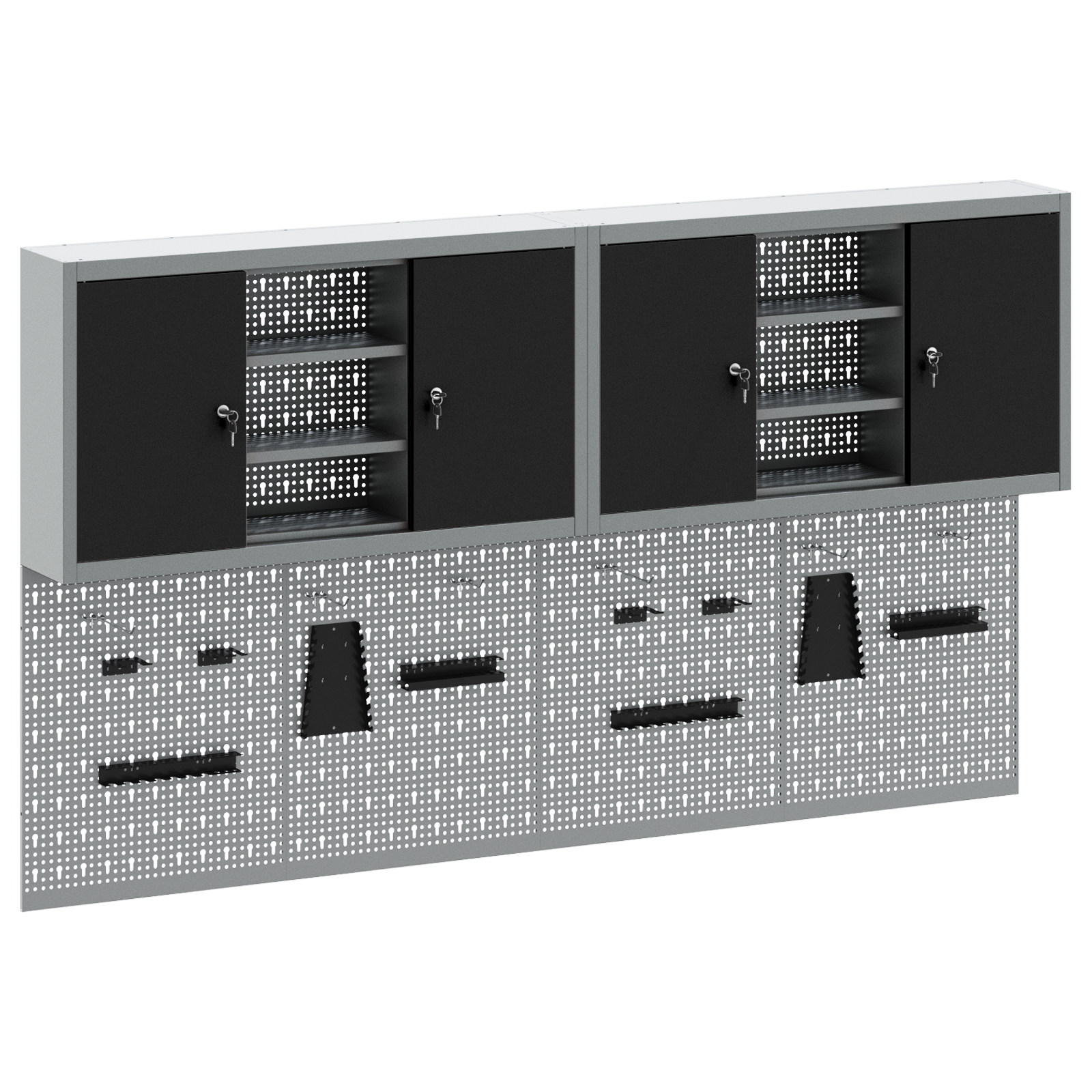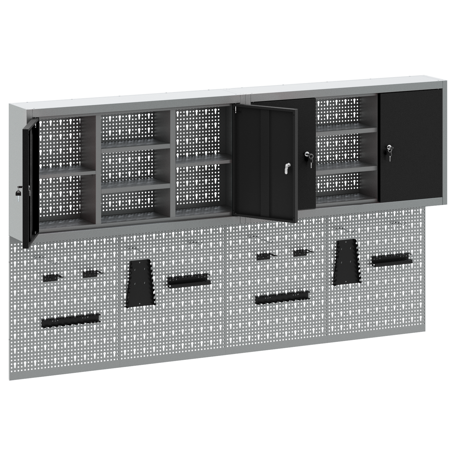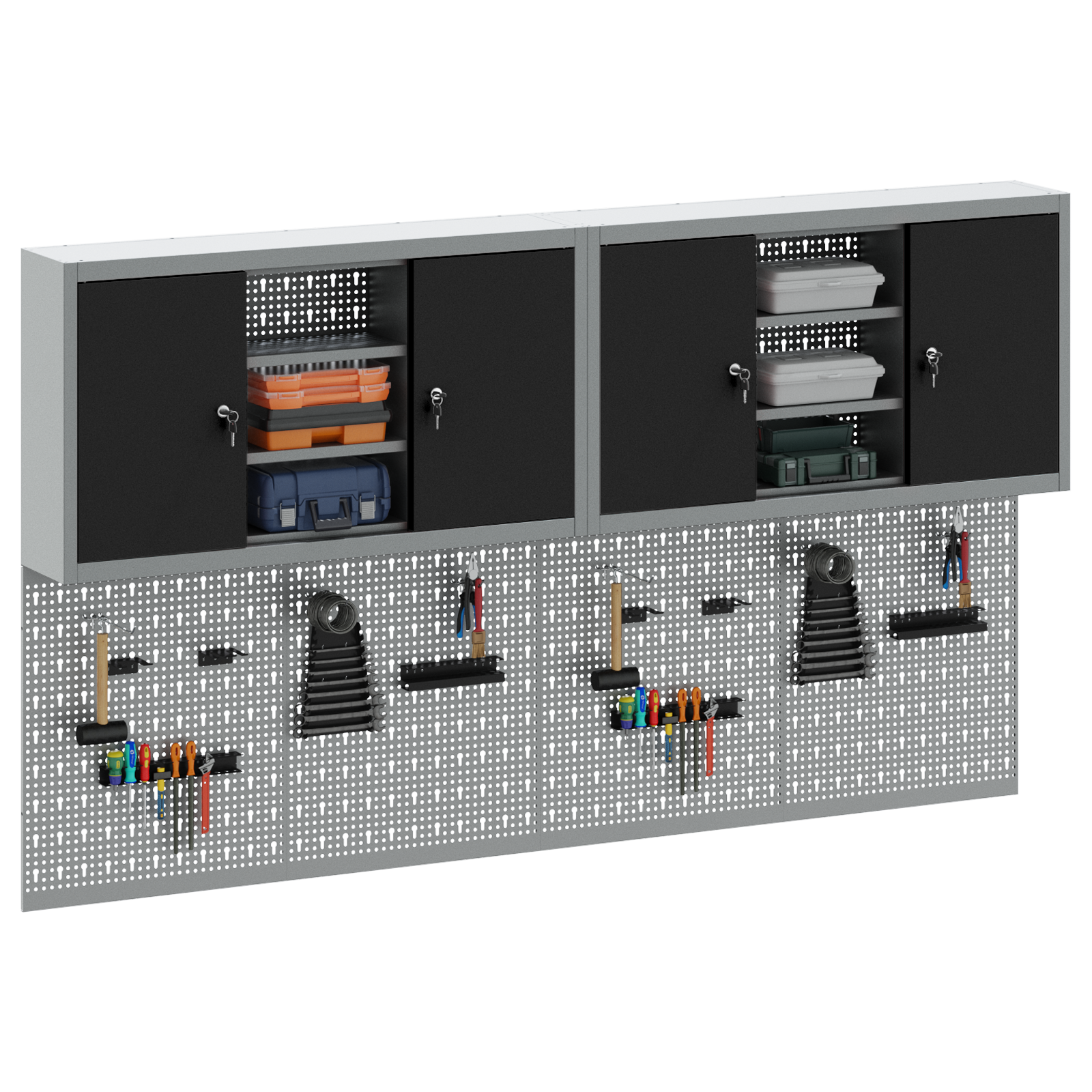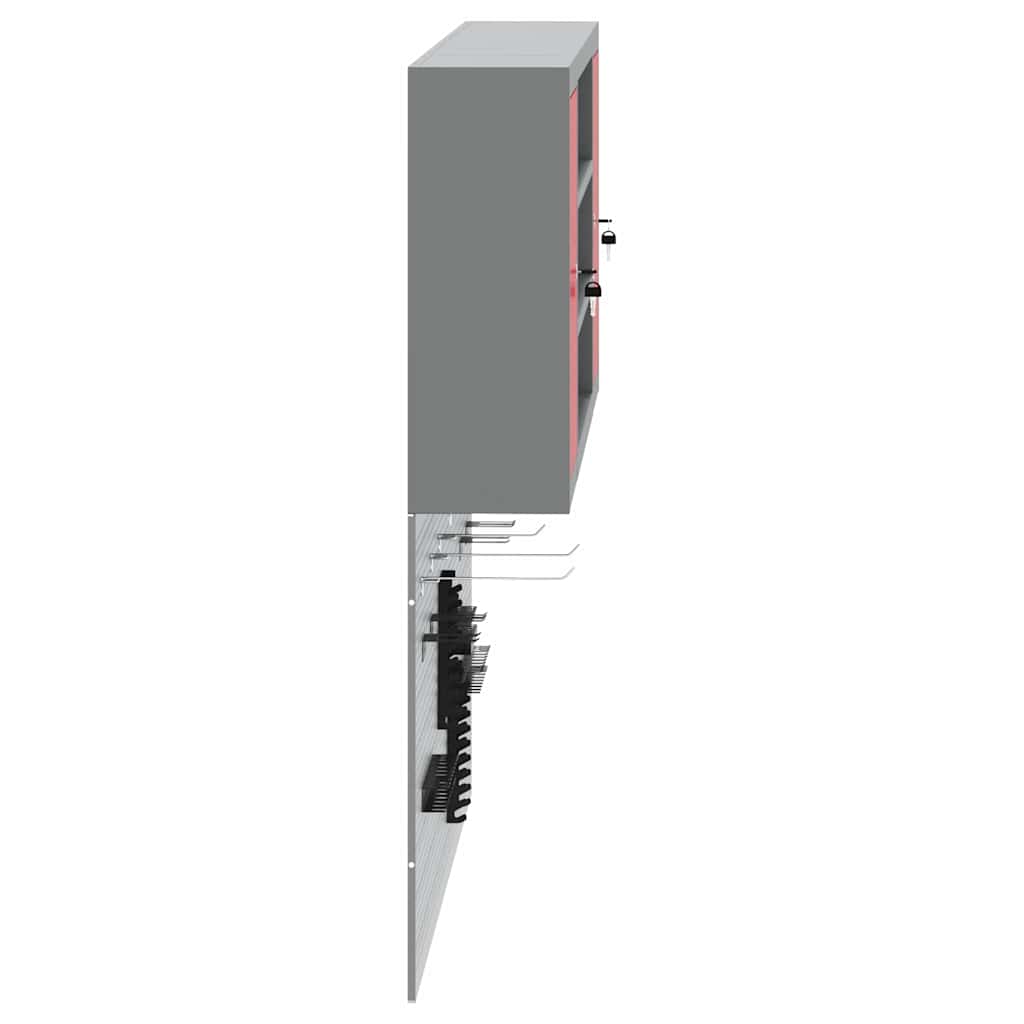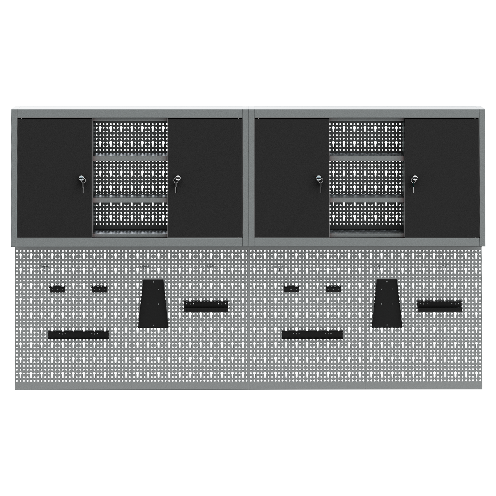 Tahle všestranná nástěnná skříňka na nářadí a souprava desek je nutnost, pokud chcete mít ve své dílně nebo garáži pořádek. S elegantním industriálním designem přináší městský nádech díky práškově lakované ocelové konstrukci a hladkému šedému povrchu. Určená do vnitřních prostor, skříňka skvěle uskladní nářadí, které bude přehledně a snadno dostupné. Integrovaná deska také zvyšuje funkčnost, protože umožňuje přizpůsobit si uspořádání nářadí podle vlastních potřeb.