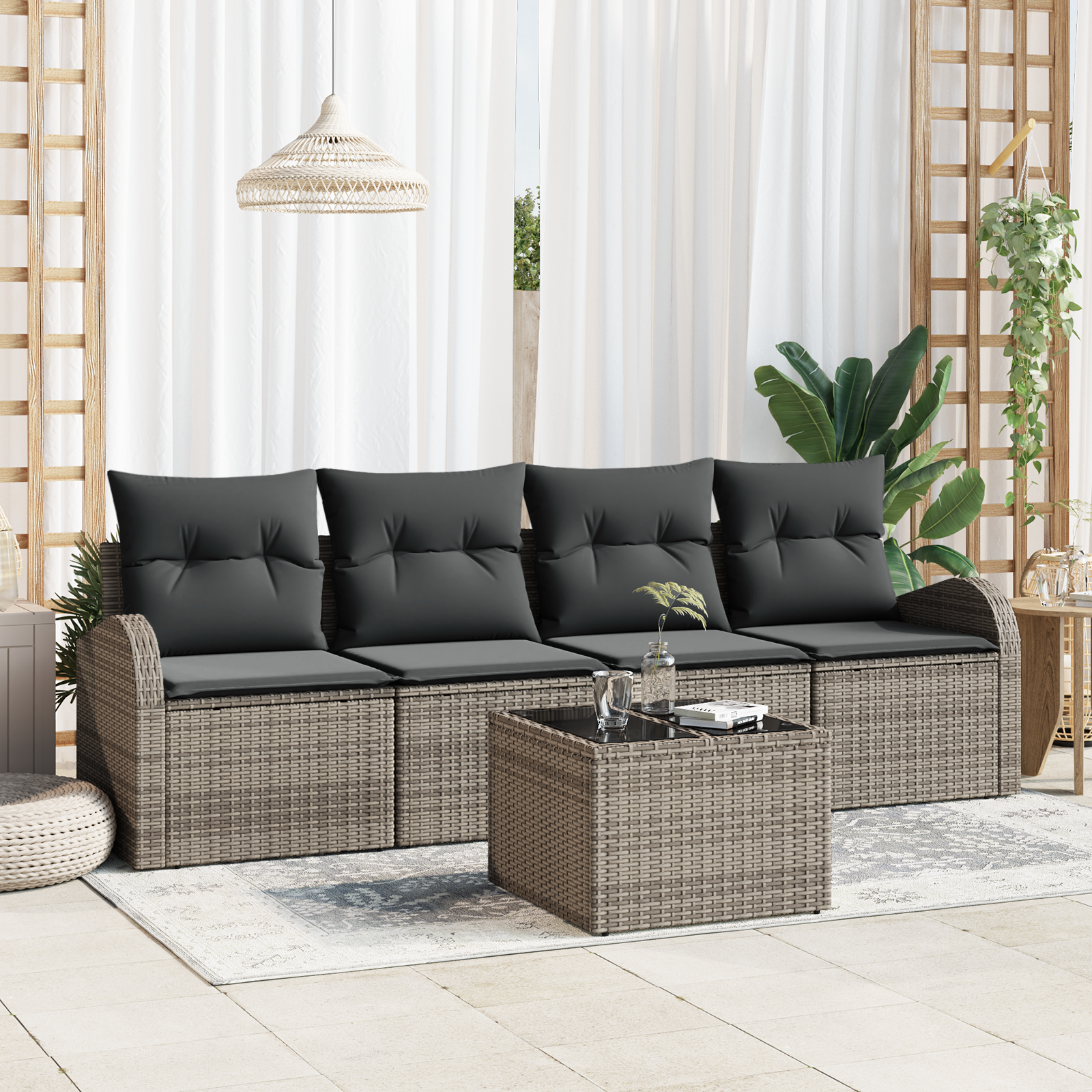 Modulární zahradní pohovka spojuje moderní design s funkční elegancí a je ideální pro zlepšení vašeho venkovního prostoru. S obdélníkovým stylem, tenhle set dodá skvělý vzhled, který si užijete při večerních srazech nebo odpoledním slunění. Navrženo pro ty, co si cení stylu a flexibility, lze rozložení upravit podle různých potřeb - od útulných míst po společenské uspořádání.