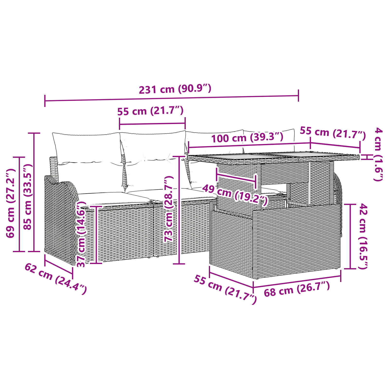 • Kompletní komponenty: Každý díl je navržen pro pohodlí a funkčnost, s luxusními polstry a zakřivenými opěrkami pro maximální relaxaci.