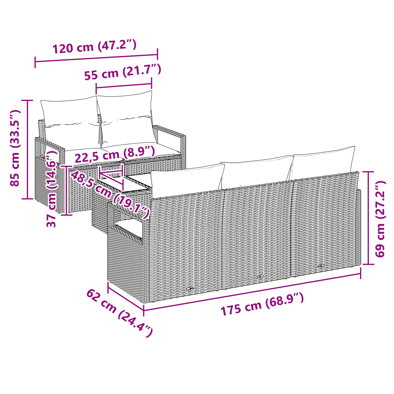 Tato sada zahradních pohovek přináší moderní styl s elegantními liniemi a praktickým designem. Je skvělá pro venkovní sezení na jaře a v létě. Pletená struktura dodává šmrnc a hodí se jak pro společenské akce, tak pro klidné chvíle na vaší zahradě nebo terase.