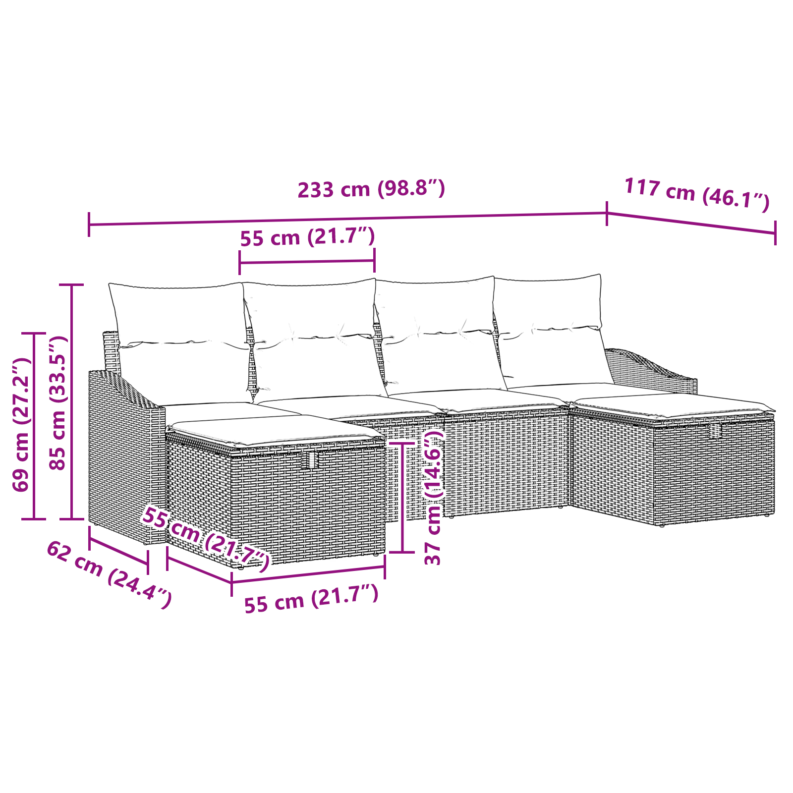 Tento zahradní gaučový set přináší do vašich venkovních prostor moderní design, který spojuje pohodlí se stylem. S jednoduchými liniemi a minimálními ozdobami je ideální kombinací funkčnosti a estetiky. Ať už hostíte návštěvy nebo si užíváte klidný okamžik venku, tento set se hodí pro každou příležitost.