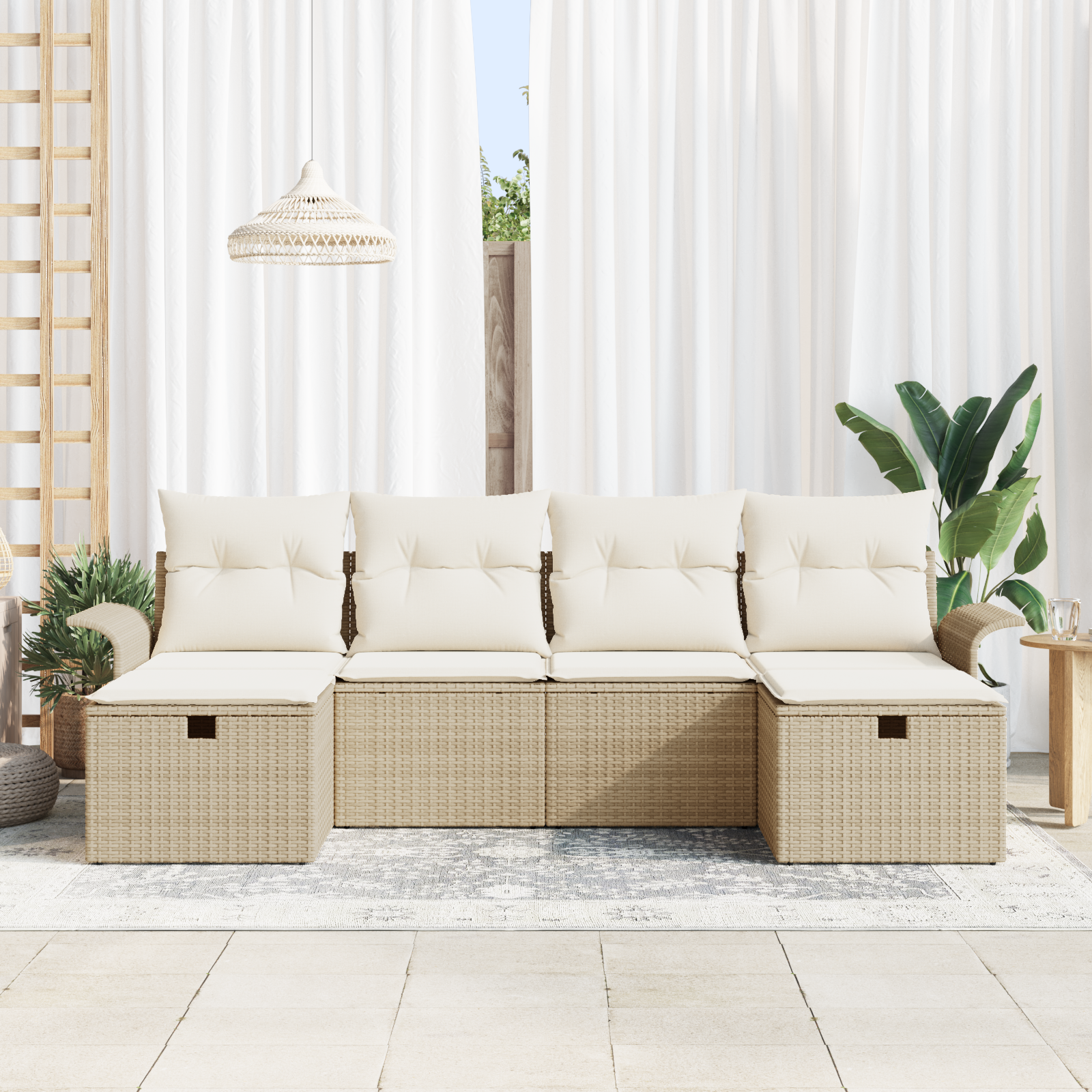 • Odolný poly ratan: Tento robustní poly ratan odolává UV záření, brání vyblednutí a zajišťuje trvalou krásu i v drsných podmínkách. Elegantní vzor tkaní dodává špetku stylu a při tom zaručuje pevnost, což z něj dělá spolehlivou volbu pro venkovní sezení.