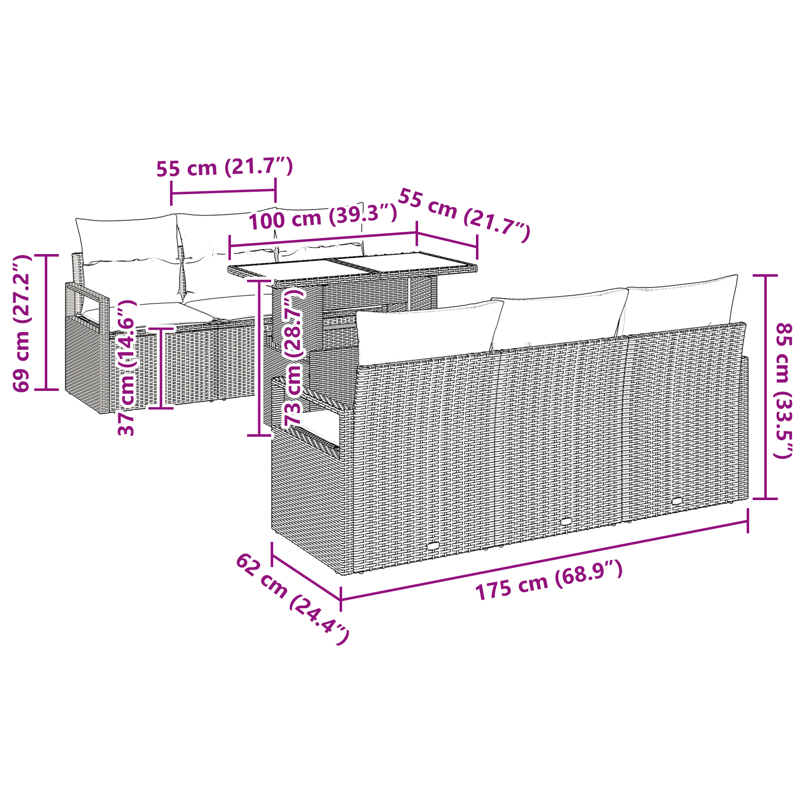 Tato modulární sada zahradních pohovek v moderním minimalistickém stylu spojuje estetiku a funkčnost pro vaše venkovní sezení. S čistými liniemi a elegantním designem promění vaši zahradu nebo terasu v příjemnou oázu pro relaxaci. Je navržená pro skupinové akce i příjemné chvíle, takže se přizpůsobí různým prostorům a nabízí relaxaci i kouzlo. Ať už si užíváte slunečné jaro nebo pořádáte letní večerní posezení, tento elegantní venkovní kus redefinuje pohodlí na vzduchu.