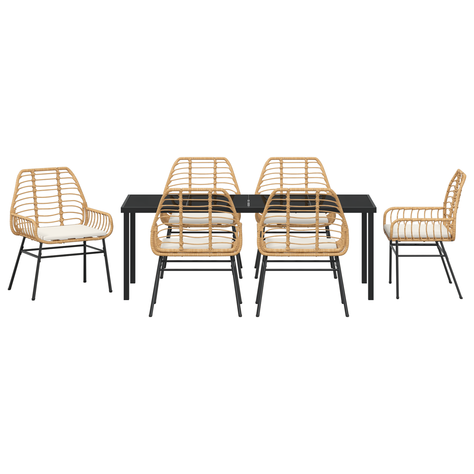 • Zahrnuté komponenty: Skleněné stolní desky jsou elegantní a trvanlivé. Opěrky z poly ratanu jsou pohodlné a stabilní nohy zaručují, že souprava je pevná na každém povrchu. Takže užijete si stylové venkovní stolování.
