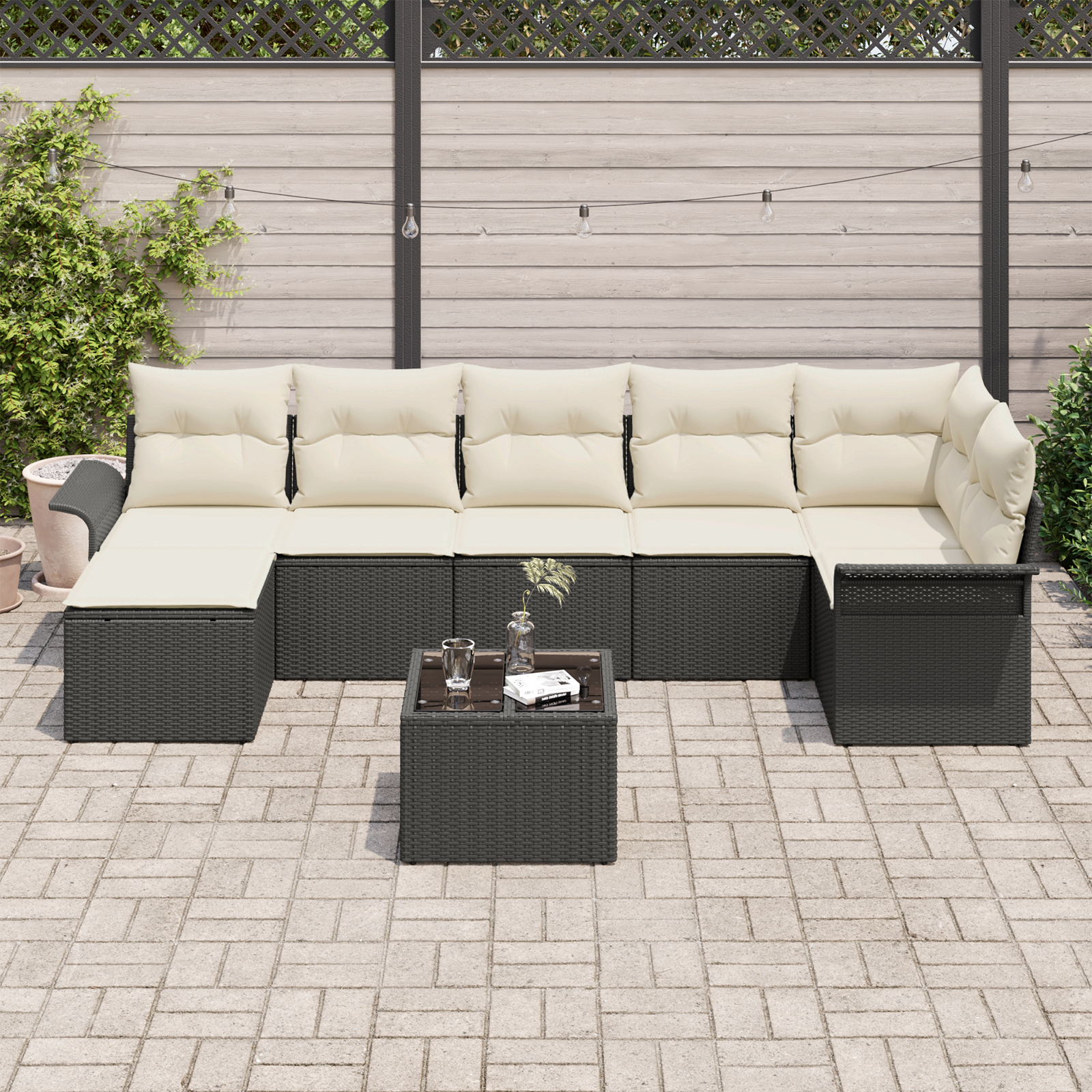 Tento modulární zahradní pohovkový set se skvěle hodí do moderního venkovního stylu a spojuje jednoduchost a funkčnost. Perfektně se hodí na zahradu nebo terasu a jeho elegantní poly ratanový vzhled v kombinaci s pevným rámem z práškované oceli vytváří skvělý dojem. Díky své modulární povaze si můžeš hrát s různými uspořádáními, takže se skvěle hodí pro každou venkovní akci, od letních grilovaček po klidné večery.