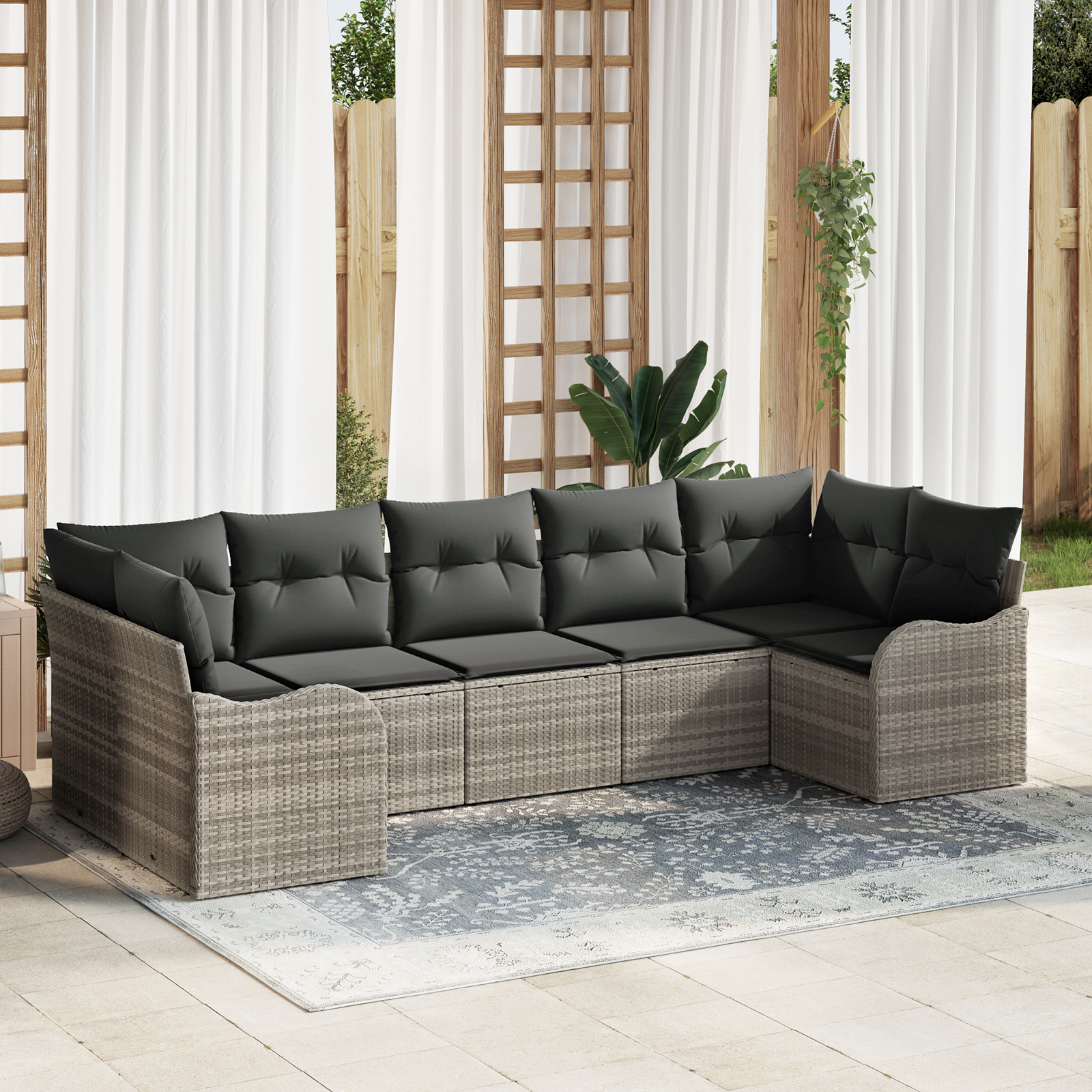 Tato zahradní pohovková souprava s polštáři je parádní místo na sezení venku ve stylovém pohodlí. Je to o moderním vzhledu a praktičnosti, což ji činí ideální pro zahradní party nebo na slunci. Tkaný polyratan jí dává elegantní nádech, suitable for co se hodí do každé zahrady nebo terasy. Díky modulárnímu uspořádání si ji můžete přesouvat podle potřeby pro všechny venkovní zábavy, ať už máte přátele nebo si prostě relaxujete sami.