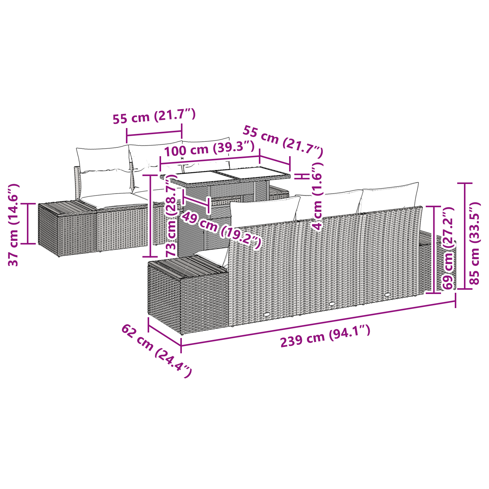 • 4 x Boční pohovka: 184×62×85 cm (Š×H×V)