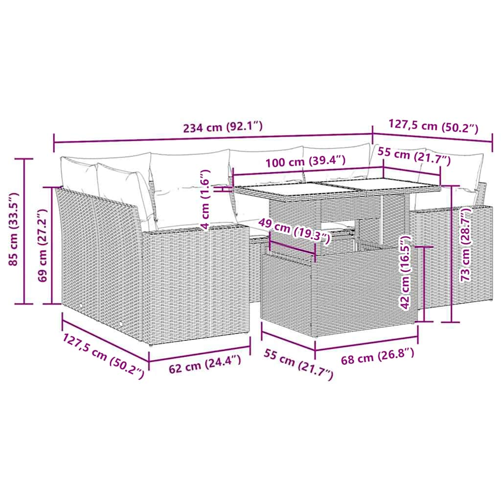 7dílná zahradní sestava s poduškami šedá polyratan akácie