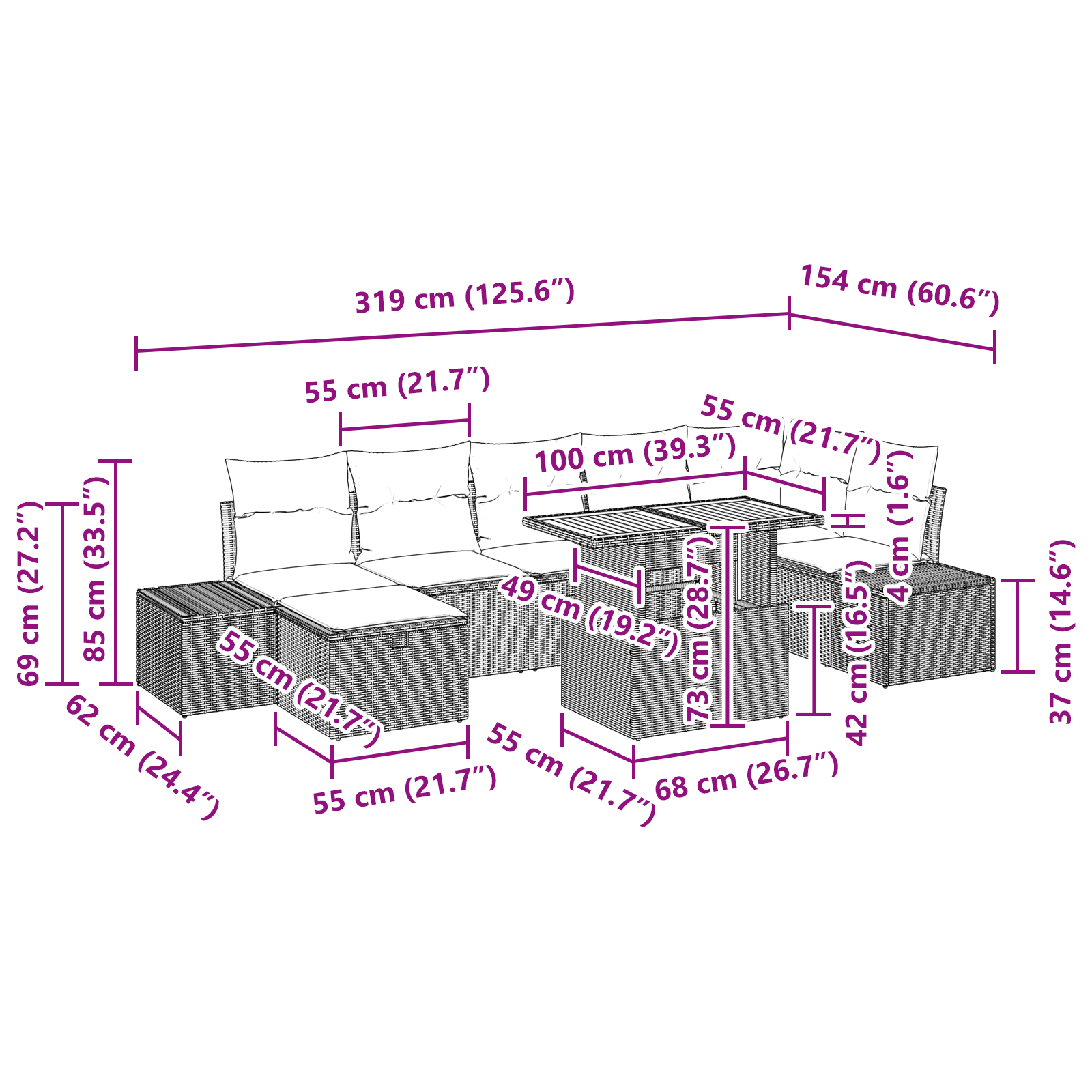 Tahle moderní zahradní sofa spojte eleganci s praktičností, takže se hodí do různých venkovních prostorů. Díky svému štíhlému modulárnímu designu spojuje střední, rohové a boční sedačky s taburetem a výškově nastavitelným stolem. Je ideální pro každého, kdo má rád minimalistický styl a pohodlné sezení venku. Kombinace poly ratanu a masivního akáciového dřeva dodává nadčasový vzhled, který ladí s moderním venkovním dekorem.