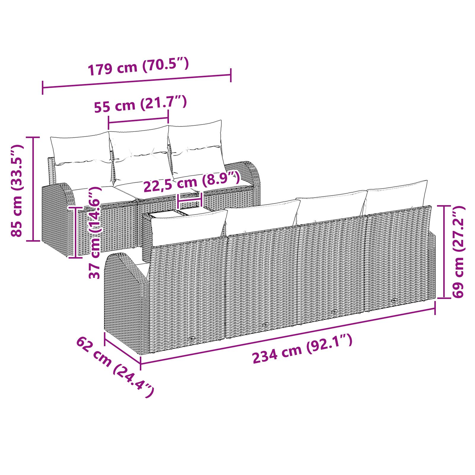 Tato moderní zahradní pohovková sestava přináší pohodlí a styl do vašeho venkovního prostoru. Navržená pro terasy nebo zahrady, sestava se vyznačuje minimalistickým designem a modulárním uspořádáním. Její čtvercový tvar se hodí do různých uspořádání, ideální pro malé setkání nebo jednostranný odpočinek. Vyrobena z kvalitních a odolných materiálů, odolává povětrnostním podmínkám a dodává venkovnímu dekoru nádech elegance. Ať už ji sdílíte s přáteli, nebo si užíváte klid, tato sestava promění vaši zahradu v příjemné útočiště.