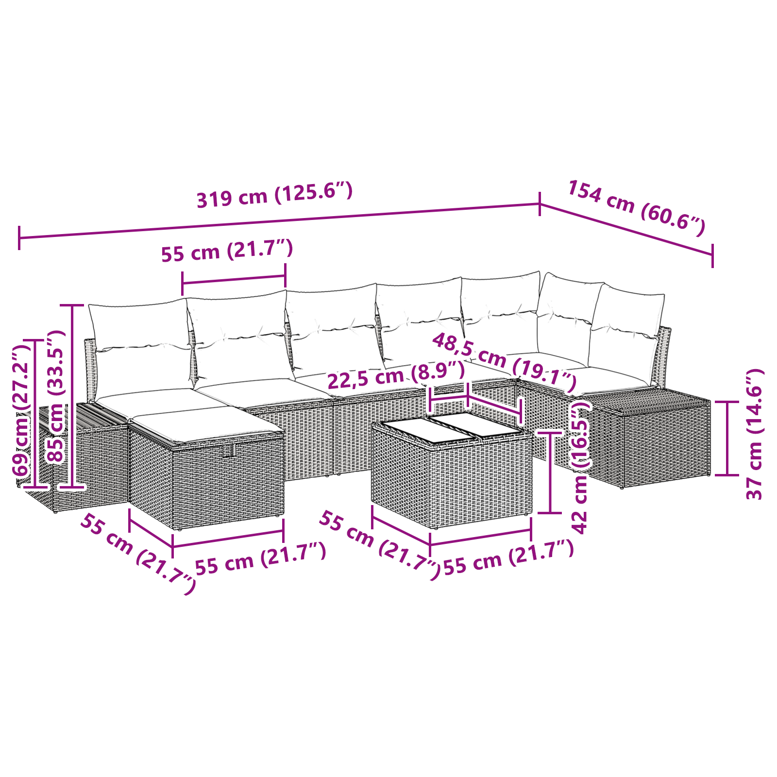 Tato moderní sada zahradního sofa nabízí styl a funkčnost, ideální pro zahrady nebo terasy. S elegantními liniemi a minimalismem pozvedne každý prostor a poskytne pohodlné sezení pro rodinná setkání nebo relaxaci s knížkou. Představte si, jak si užíváte jarní vánek a relaxujete na této stylové sadě, zatímco se bavíte s přáteli a proměníte svůj venkovní prostor na příjemnou oázu.