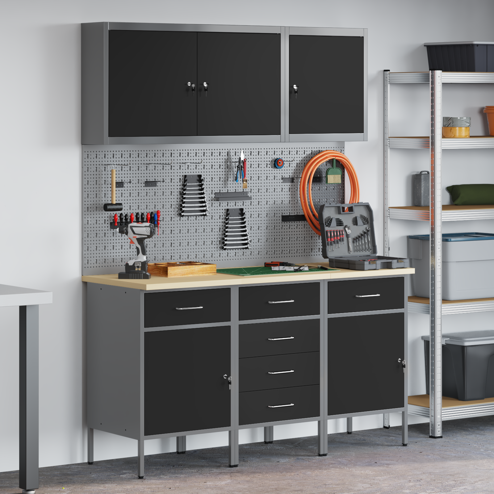• Ocelový rám: Tento skříň s inženýrským dřevem a ocelí zaručuje pevnost a dlouhou životnost. Silný rám poskytuje solidní základ pro těžké nástroje a vybavení. I přes impozantní konstrukci se materiály pyšní štíhlým vzhledem, což potěší oko v každé dílně. Údržba je jednoduchá – stačí otřít vlhkým hadříkem, aby skříň vypadala jako nová.