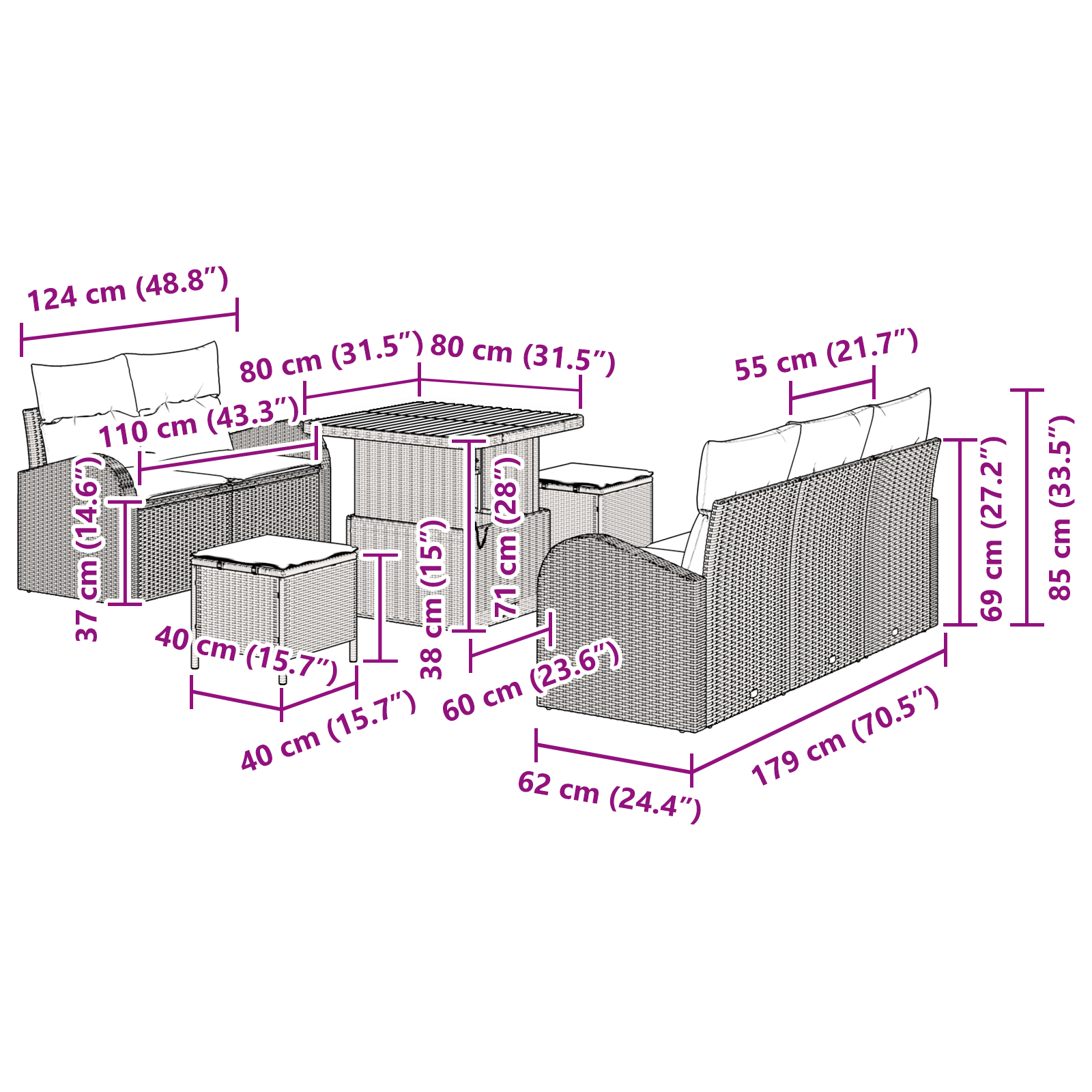 • 1 x střední sedačka: 55 x 62 x 85 cm (ŠxHxV)
