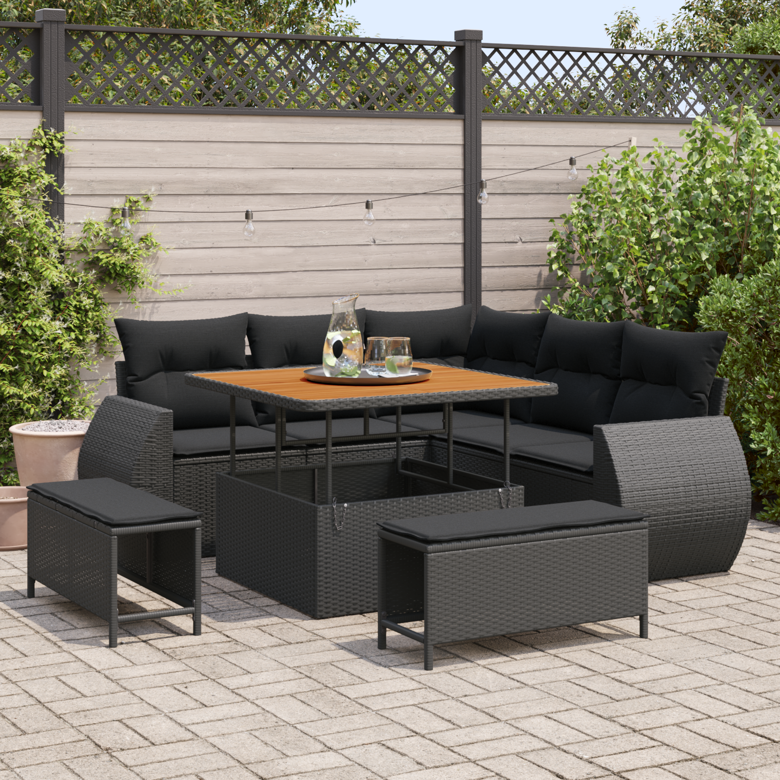 Tato modulární zahradní pohovková souprava je super flexibilní a hodí se na slunné terasy i do rušných zahrad. Moderní design zaručuje pohodlný a stylový prostor pro relaxaci a schůzky venku. Ideální pro venkovní posezení, kde si můžete užívat slunečné počasí.