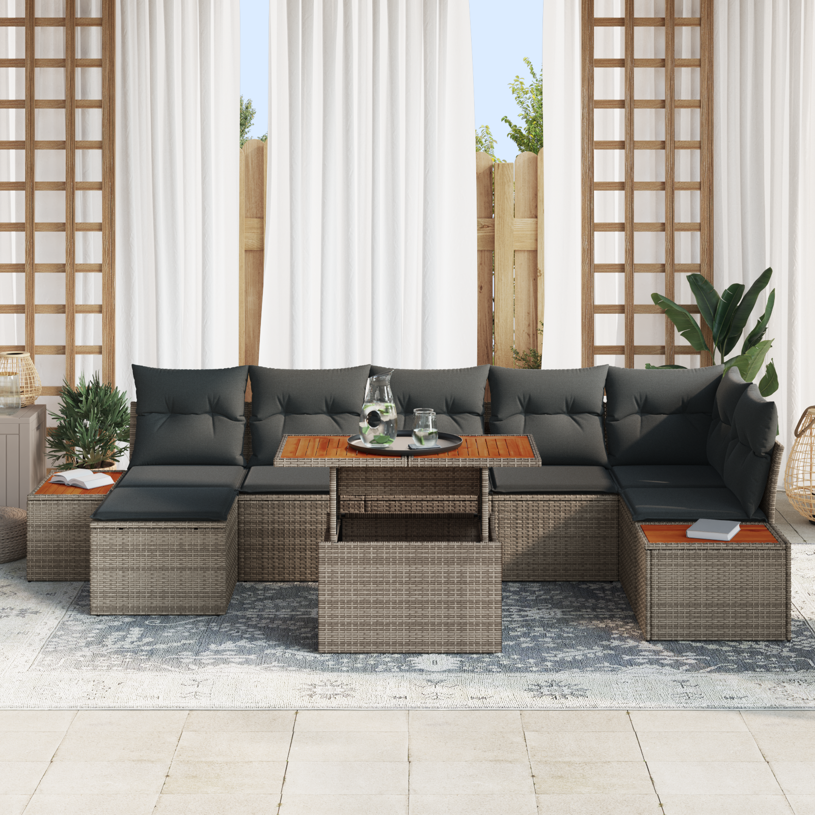 Tato současná zahradní jídelní souprava nabízí jedinečnou kombinaci stylu a funkce, ideální pro venkovní setkání. Elegantní poly ratanový design, spolu s masivním akáciovým dřevem, vytváří stylové a odolné středobod pro zahradní nebo terasové stolování. Její robustní konstrukce nabízí spolehlivou možnost pro víkendové obědy, uvolněné nedělní večeře nebo spontánní setkání, vytvářející útulné prostředí pro vzpomínky pod otevřeným nebem. Matný povrch vyzařuje sofistikovanou, ale vítající atmosféru, což z této jídelní soupravy činí rafinovaný doplněk jakéhokoli venkovního prostoru.