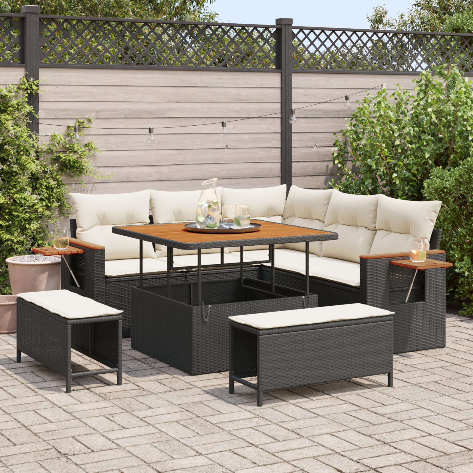 Tahle zahradní sofa sada, určená na terasy a do zahrad, přináší moderní eleganci s minimalistickým designem a čistýma liniema. Skvělá na povalování nebo organizování večírků, kombinuje pěkný poly ratan s odolným rámem z práškově lakované oceli. Tkaný povrch dodává zajímavý rozměr, zatímco kombinace počasí odolných materiálů zajišťuje, že si bude držet kvalitu napříč ročními obdobími. Sada je obohacena o pohodlné polštáře, které se dají kdykoliv vyjmout a vyměnit, takže se skvěle hodí pro různé styly a prostředí. To vše zajišťuje, že si užijete nejen společenské události, ale i klidné chvilky při relaxaci.