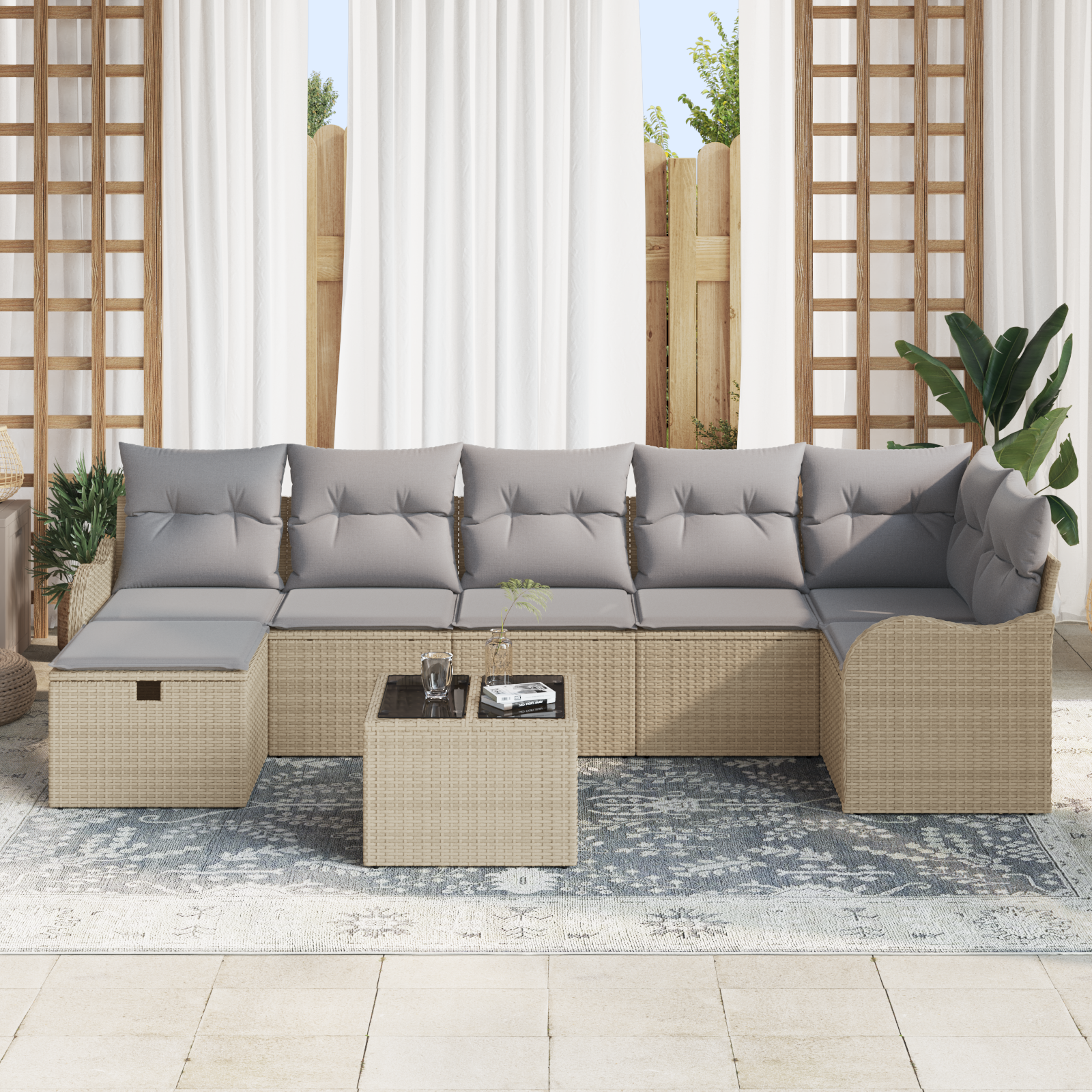 Tahle modulární zahradní pohovková sada je navržená tak, aby pozvedla jakýkoli venkovní prostor a zároveň vypadala elegantně. S jednoduchými a čistými linkami je ideální pro ty, co mají rádi minimalistický styl. Její decentní vzhled se hodí ke každé venkovní dekoraci, od malých balkonů po velké zahrady. Perfektní pro setkání s přáteli nebo na relaxaci.