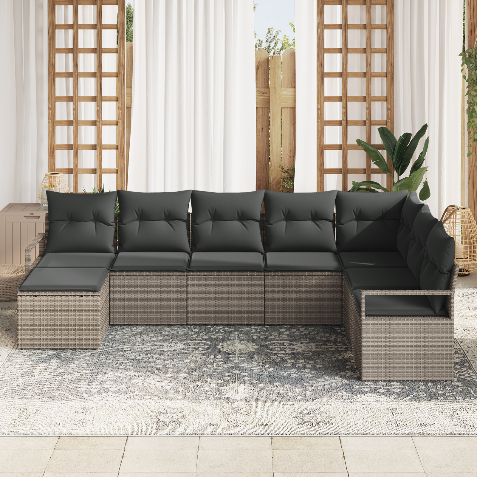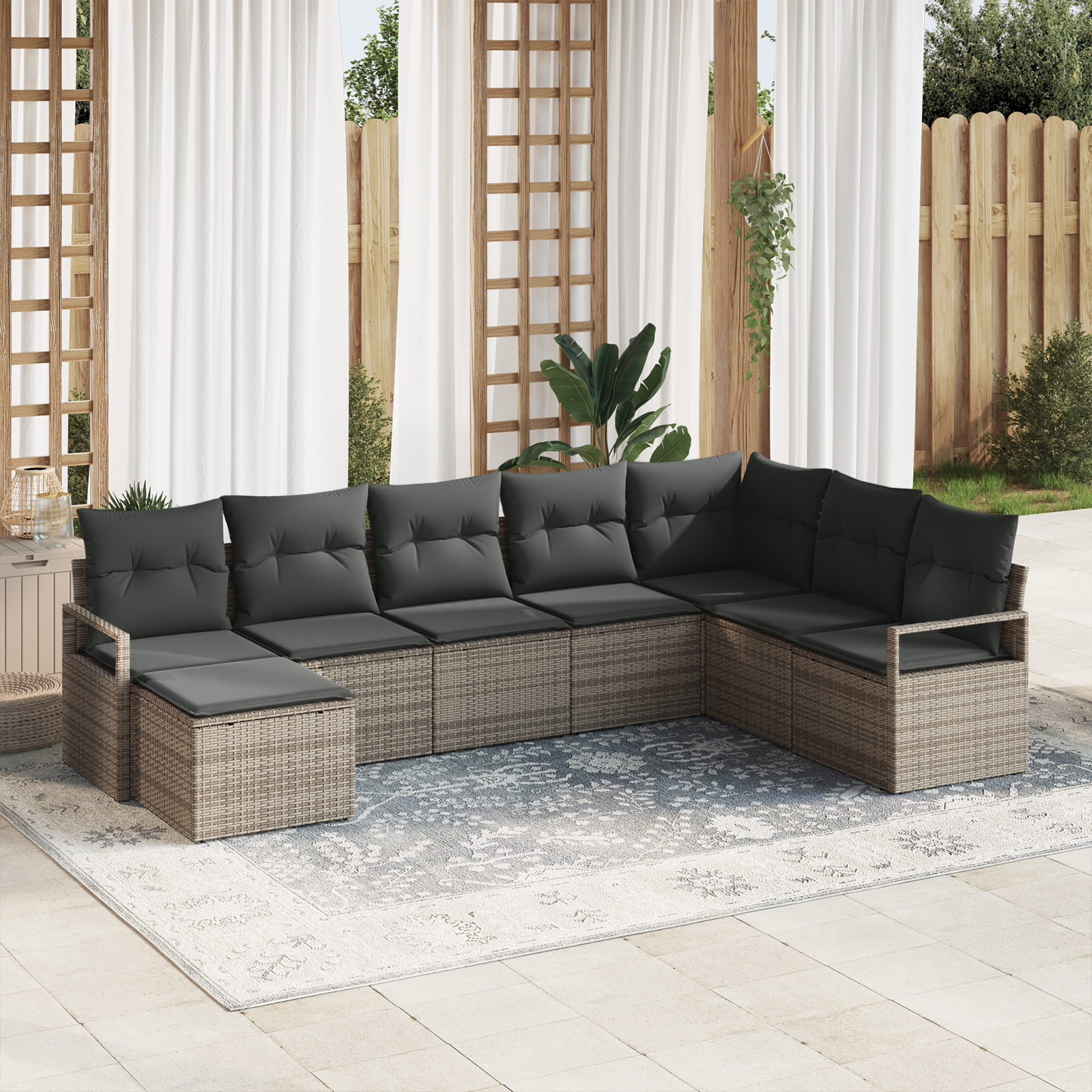 Tento zahradní pohovkový set přináší moderní eleganci s jednoduchým designem, ideálním pro venkovní použití. Je obdélníkový a vyrobený z tkaného poly ratanu a odolného ocelového rámu, takže vypadá skvěle a je funkční. Nabízí pohodlný prostor na relaxaci nebo hostování, takže si užijete venkovní zábavu díky modulu, který se dá různě kombinovat.