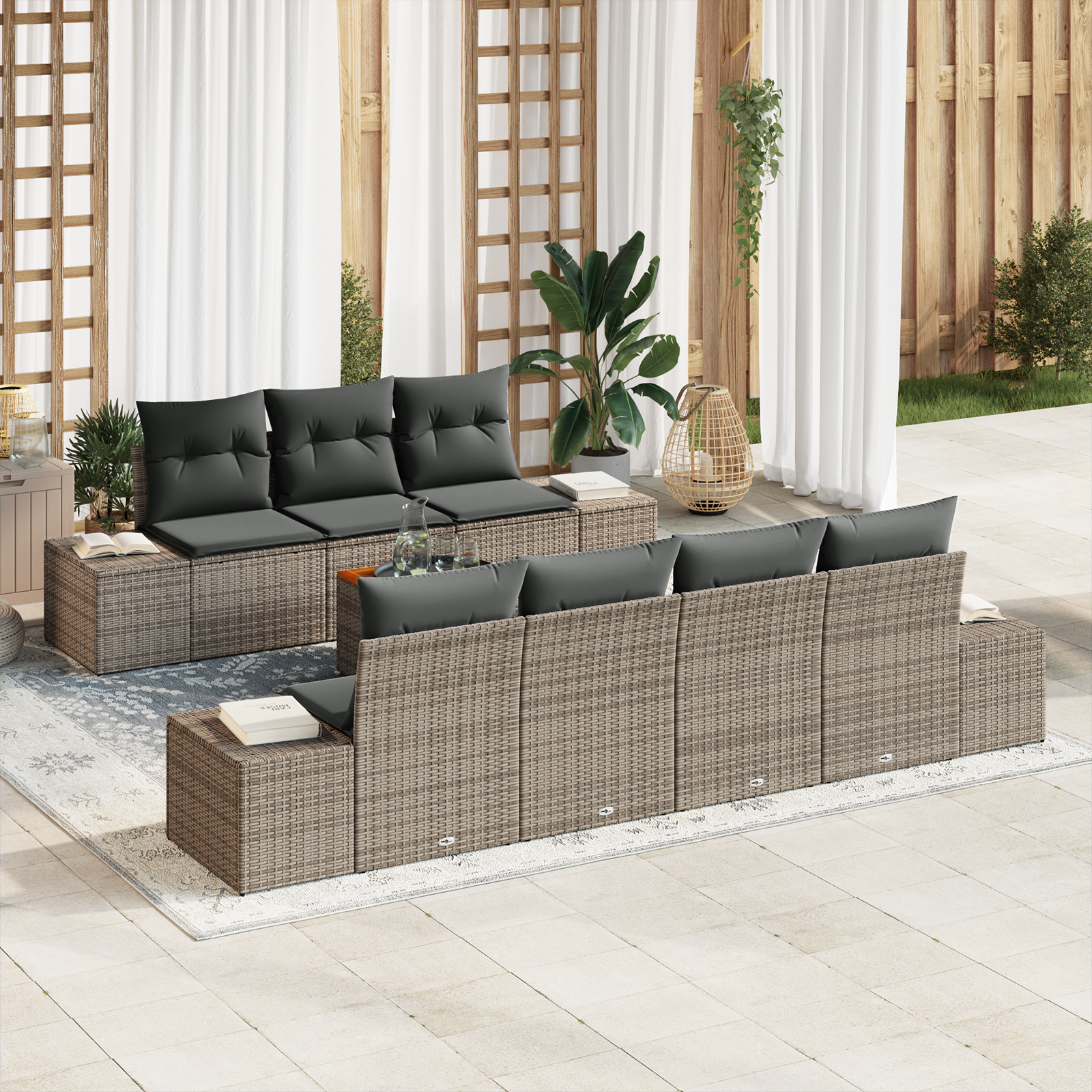 Tento moderní zahradní pohovkový set je skvělou volbou pro venkovní nábytek, ideální pro každou terasu nebo zahradu. Navržený pro moderní majitele domů, spojuje styl a funkčnost se svým krásným designem a modulárními prvky, které nabízejí spoustu možností uspořádání. Ať už si užíváte slunce v létě nebo pořádáte venkovní akci, tento set poskytuje univerzální sezení, které hezky ladí s moderními exteriéry. Je vyrobený z polyratanu a akáciového dřeva, takže vypadá sofistikovaně a pohodlně zároveň.