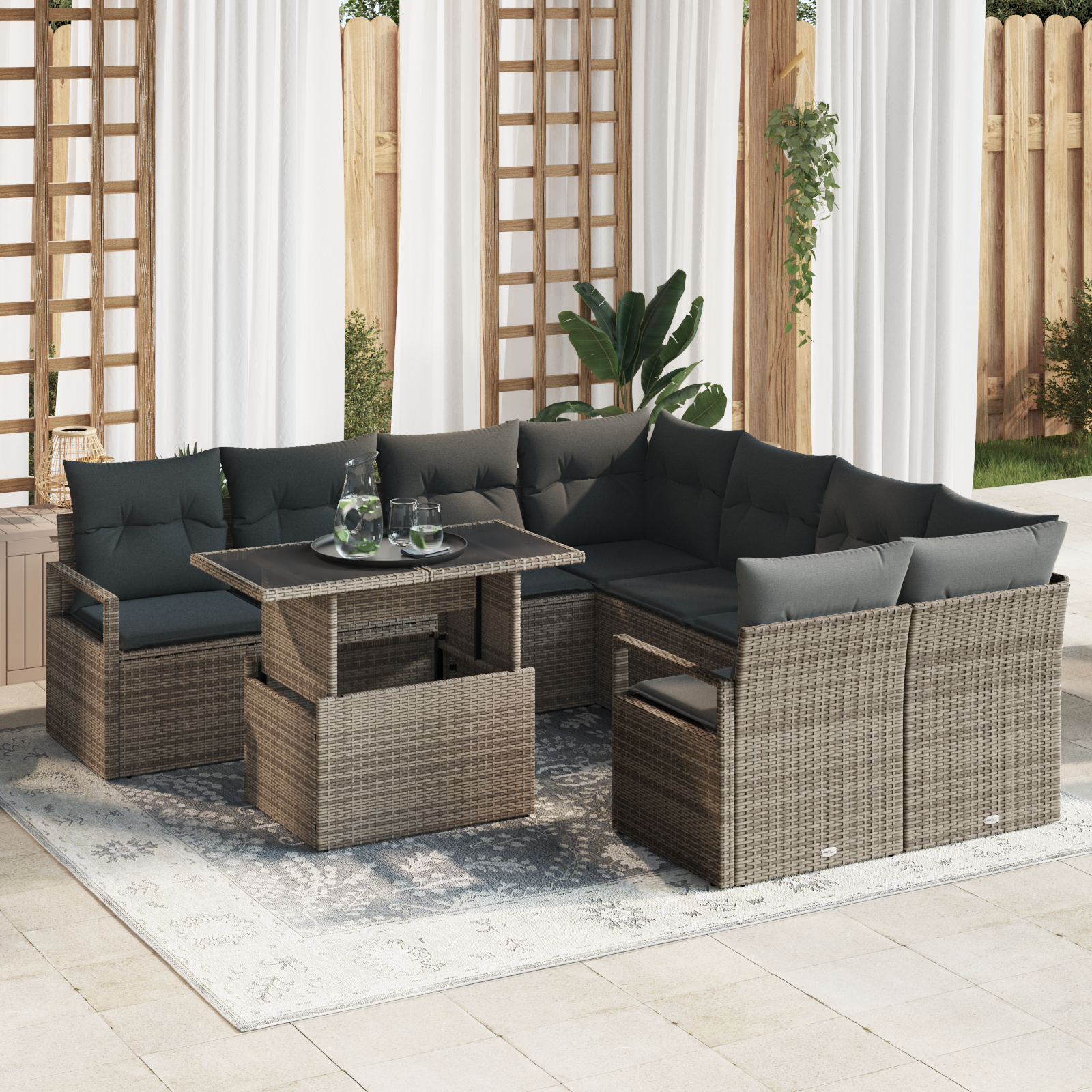 Tento modulární zahradní pohovkový set je skvělý pro venkovní relaxaci, pořádání přátel, nebo i jen tak pro klidný okamžik venku. Moderní design s jednoduchými liniemi perfektně zapadne do jakékoliv zahrady nebo na terasu, takže se snadno integroval do vašeho venkovního prostředí. Je navržen tak, aby byl nejen krásný, ale také funkční. Obohatí vaši venkovní zkušenost svou univerzálností a pohodlím, takže každá chvíle strávená venku je příjemná a luxusní.