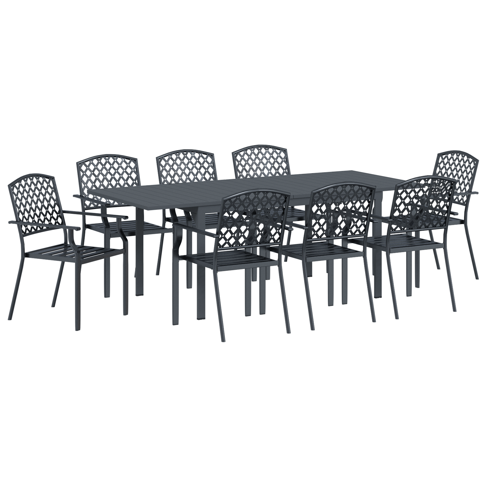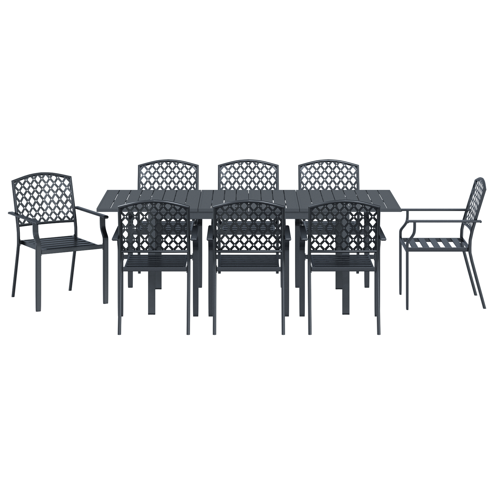 Tento moderní zahradní jídelní set je úžasný pro všechny, co mají rádi současný design a funkčnost venkovních prostor. S obdélníkovým tvarem, elegantním ocelovým stolem a odpovídajícími židlemi dodá styl jakékoli zahradě nebo terase. Jeho minimalistický styl a čisté linie jsou skvělé pro rodinná setkání nebo večeře, kde styl jde ruku v ruce s praktičností.