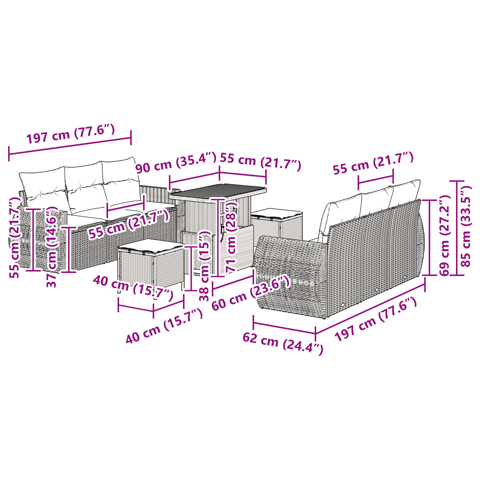 Tato multifunkční zahradní pohovka mění venkovní odpočinek s jejím moderním modulárním designem. Elegantní provedení má čisté linie a málo ornamentů, ideální pro zahrady a terasy. Tento set pohovek je perfektní volba pro venkovní nadšence, kteří si cení stylu i praktičnosti, poskytuji příjemné místo na relaxaci a setkávání s lidmi. Užívejte si chvíle venku, když moderní vzhled nábytku zapadá do okolí a zkrášluje jakoukoli venkovní plochu.