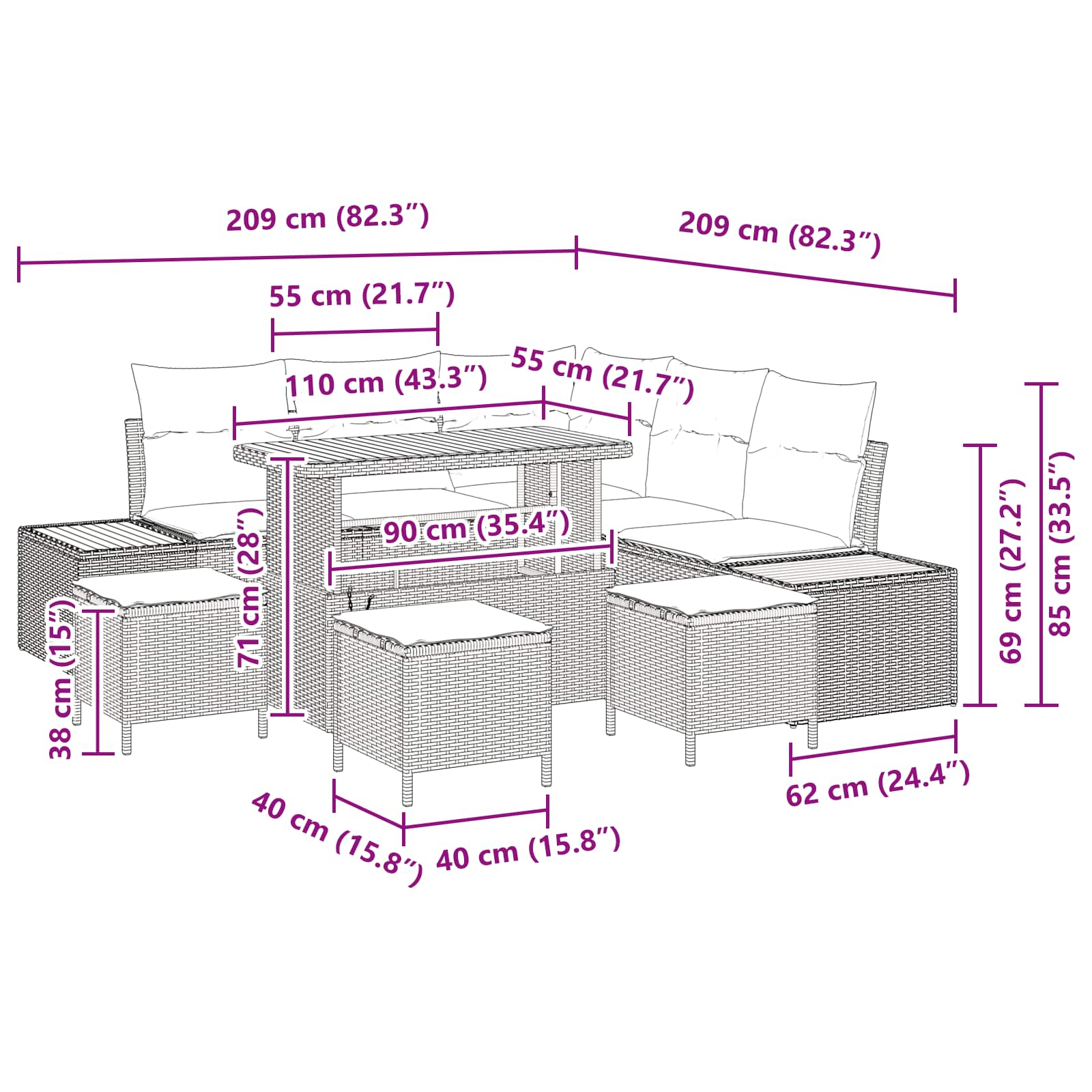 Tato moderní zahradní pohovková sada přináší eleganci a pohodlí do vašich venkovních prostor. S hladkým designem a funkčností je ideální pro hosty nebo poklidné večery. Kombinace odolného poly ratanu a pohodlných pěnových polštářů je perfektní pro váš venkovní odpočinek. Modulární uspořádání umožňuje přizpůsobit set pro jakýkoli dvorek nebo terasu, takže se stane součástí vašich odpočinkových chvil.