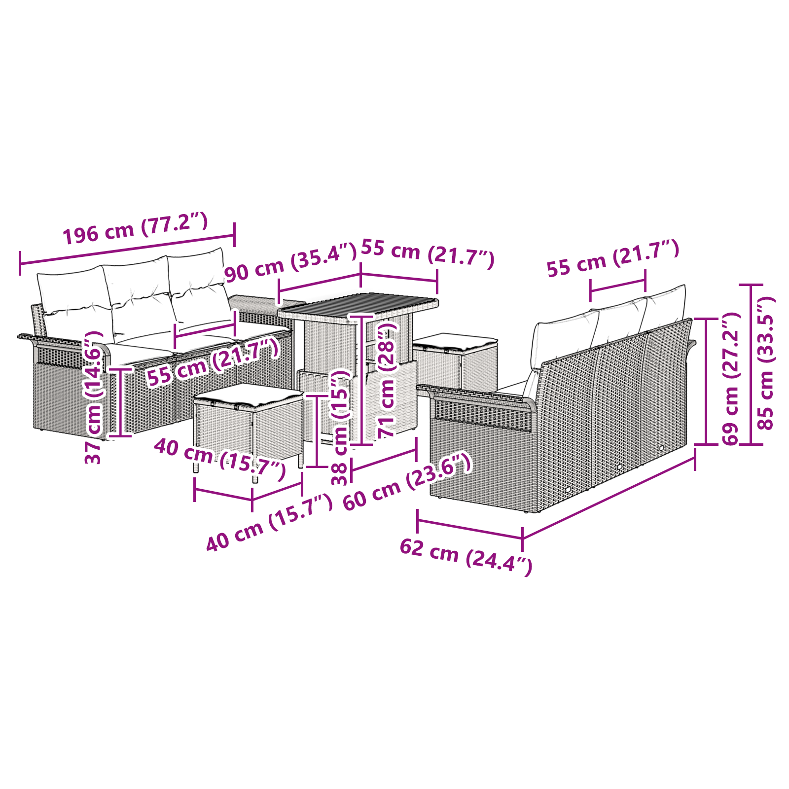 Tato moderní zahradní sedací souprava promění váš venkovní prostor na příjemné místo k relaxaci. S jednoduchým a funkčním designem je ideální pro jarní a letní sešlosti. Perfektní volba pro ty, kteří hledají stylový a všestranný venkovní nábytek.