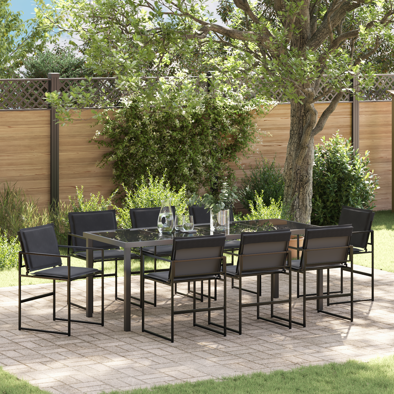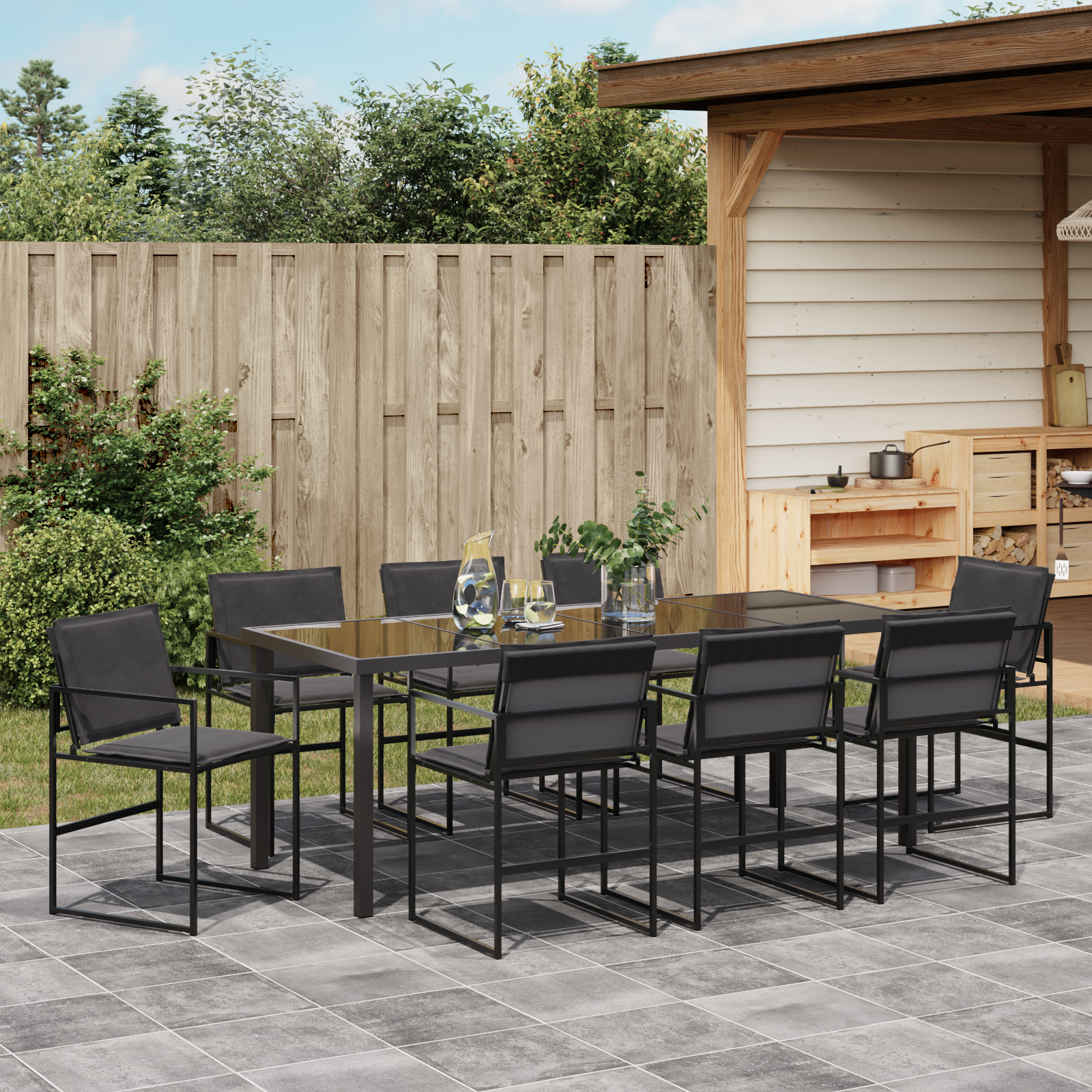 Tato moderne zahradní sada spojuje jednoduchý a praktický styl, takže vaše venkovní prostory budou vypadat skvěle. Navržena pro pohodlné jarní a letní chvíle, má čisté linie a minimální zdobení, které dodá každé zahradě nebo terase šmrnc. Představte si, jak vítáte rodinu a přátele k venkovnímu stolování v tomto krásném prostředí. Černý rám se hladkými texturami zvou hosty, aby se pohodlně usadili a užili si vaši zahradu – je to ideální místo pro jakoukoli akci.