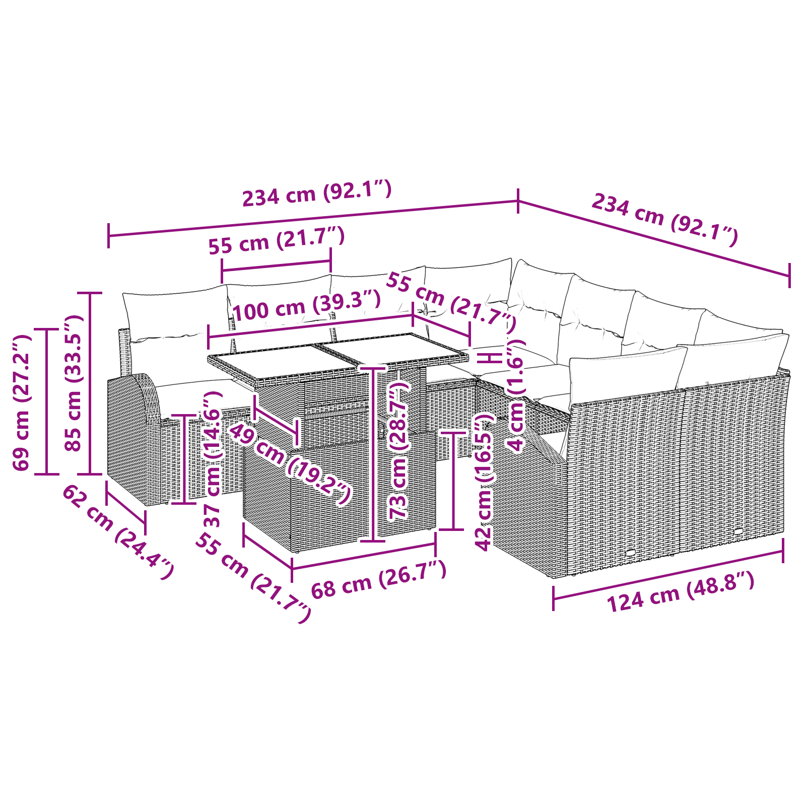 Tahle modulární zahradní sedací souprava vnese do každého venkovního prostoru šmrnc a variabilitu. Její moderní vzhled s čistými liniemi ti poskytne skvělé místo na relax a zábavu. Skvělá volba pro zahrady a terasy, povrch z poly ratanu dělá sezení lákavým a luxusním, ideálním pro jarní a letní akce nebo klidné chvíle.