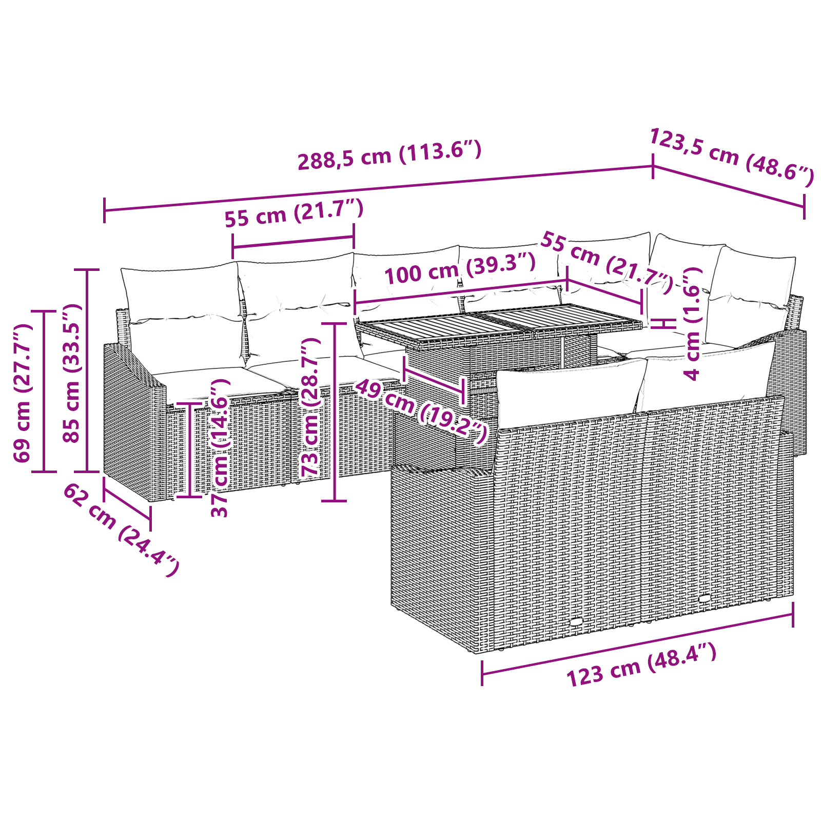 Tato sada zahradního gauče z poly ratan epitomizuje moderní design, charakterizovaný čistými liniemi a minimálními ornamenty. Kombinující funkčnost se stylem, je sada ideální pro současné venkovní prostředí, dodávající sofistikovaný šmrnc zahradním prostorům nebo terasám. Modulární design umožňuje plynulé přizpůsobení, doplňující různé venkovní estetiku, zatímco podporuje univerzální uspořádání, které vyhovuje setkáním, malebným výhledům nebo klidným posezením u přírody.