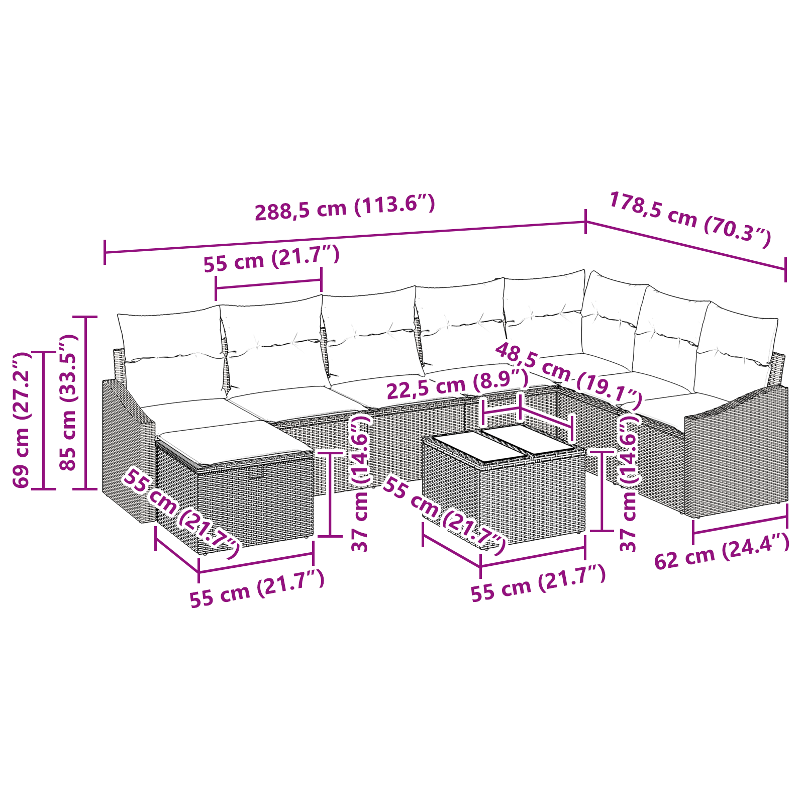 Sada moderních modulárních venkovních pohovek pro 8 přidá do vaší zahrady nebo terasy styl. Její moderní design a flexibilní uspořádání jsou ideální pro každý venkovní prostor. Je pohodlná a poskytuje příjemné místo na lenošení s přáteli.