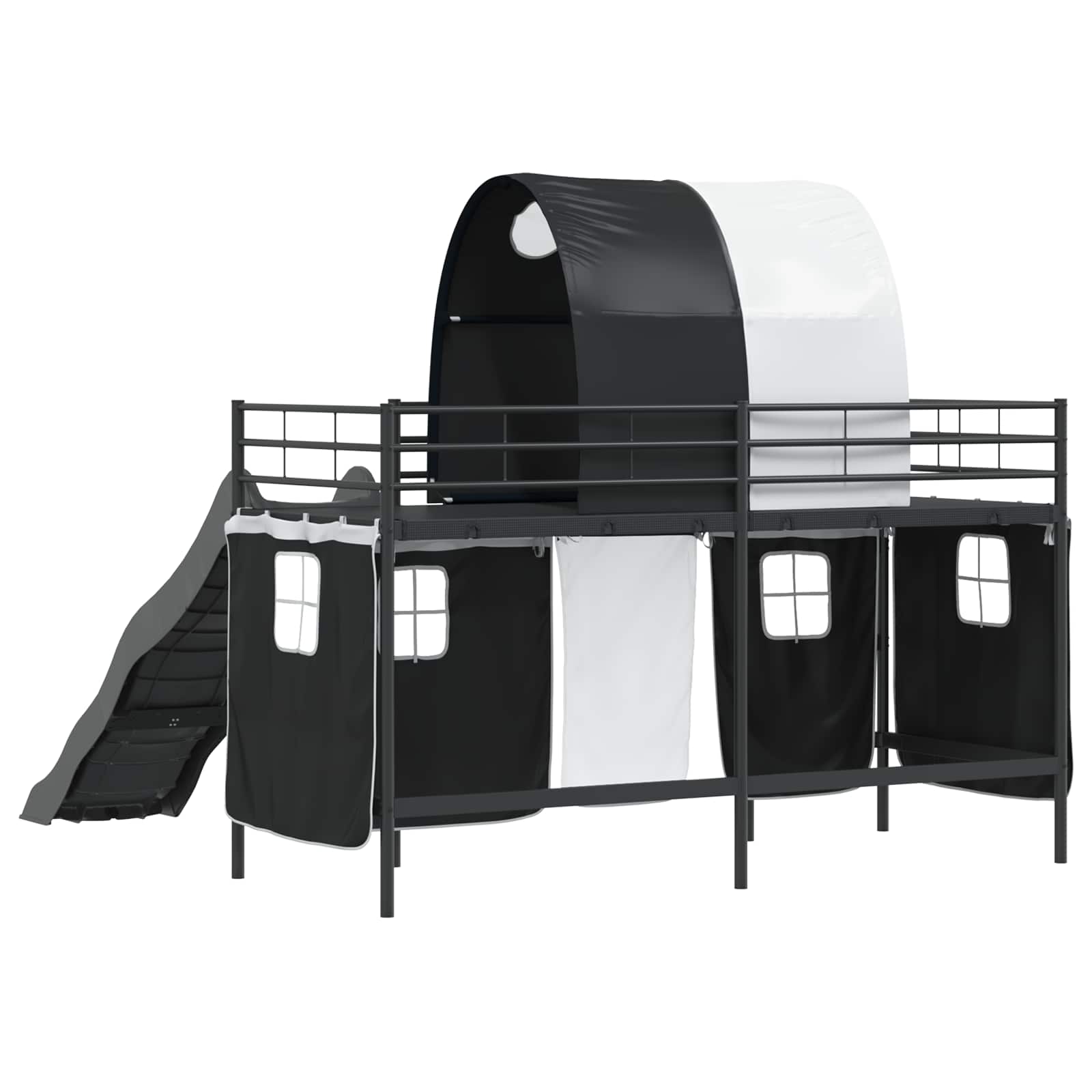 Dětská podkrovní postel se závěsy, obloukem a skluzavkou je navržena tak, aby spojila zábavu s praktičností a vytvořila příjemný spánek, který si děti zamilují. S moderním vzhledem se snadno hodí do jakéhokoliv dětského pokoje. Odolné materiály a hravá skluzavka nabízejí skvělé prostředí pro odpočinek a fantazii. Její kombinace černé a modré barvy dodává moderní říz každému pokoji, takže je super a vzrušující součástí vaší domácnosti.