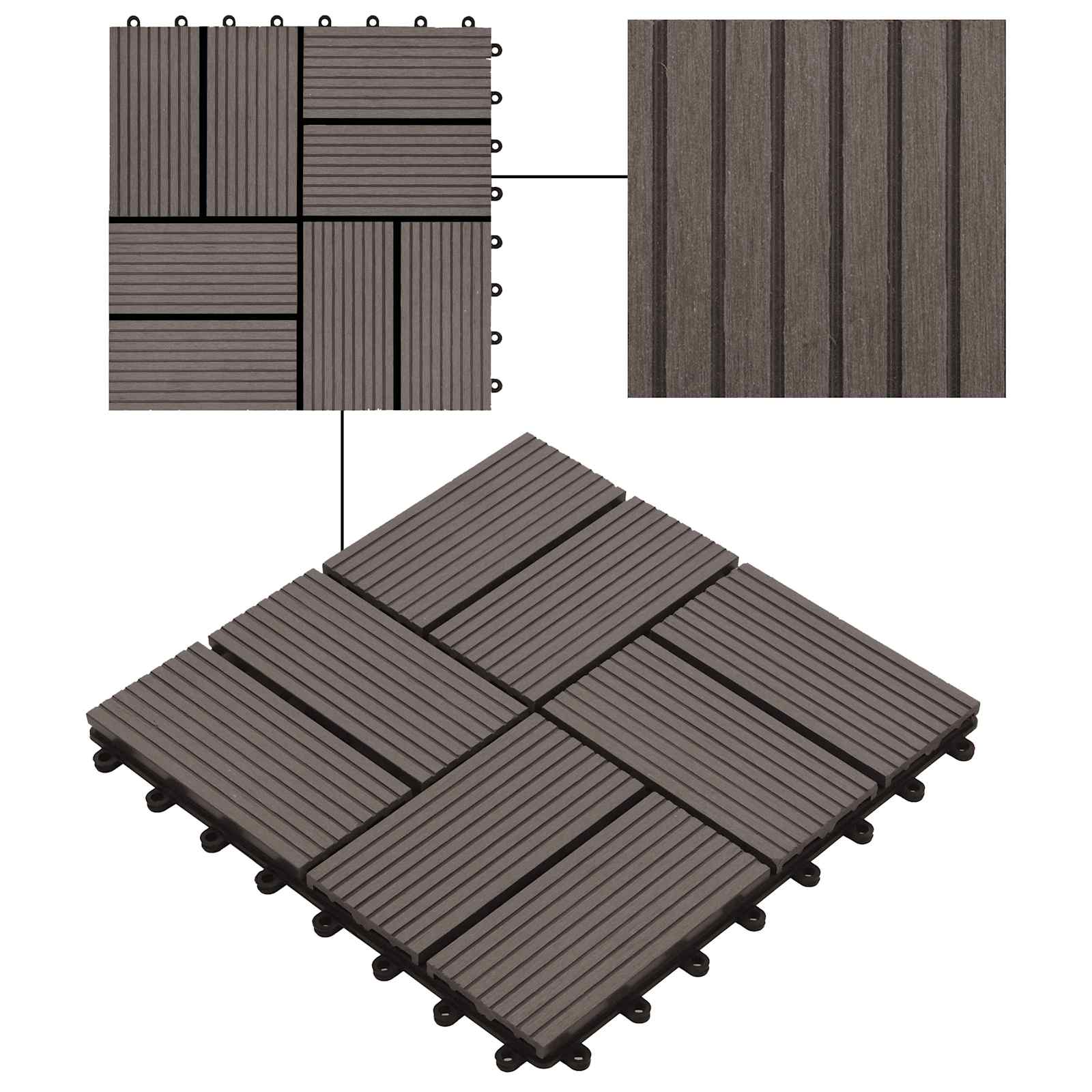 • Prémiový materiál: Vyrobeno z WPC, dlaždice spojuje krásu dřeva se stabilitou kompozitních materiálů. Povrch je hladký a příjemný na dotek.