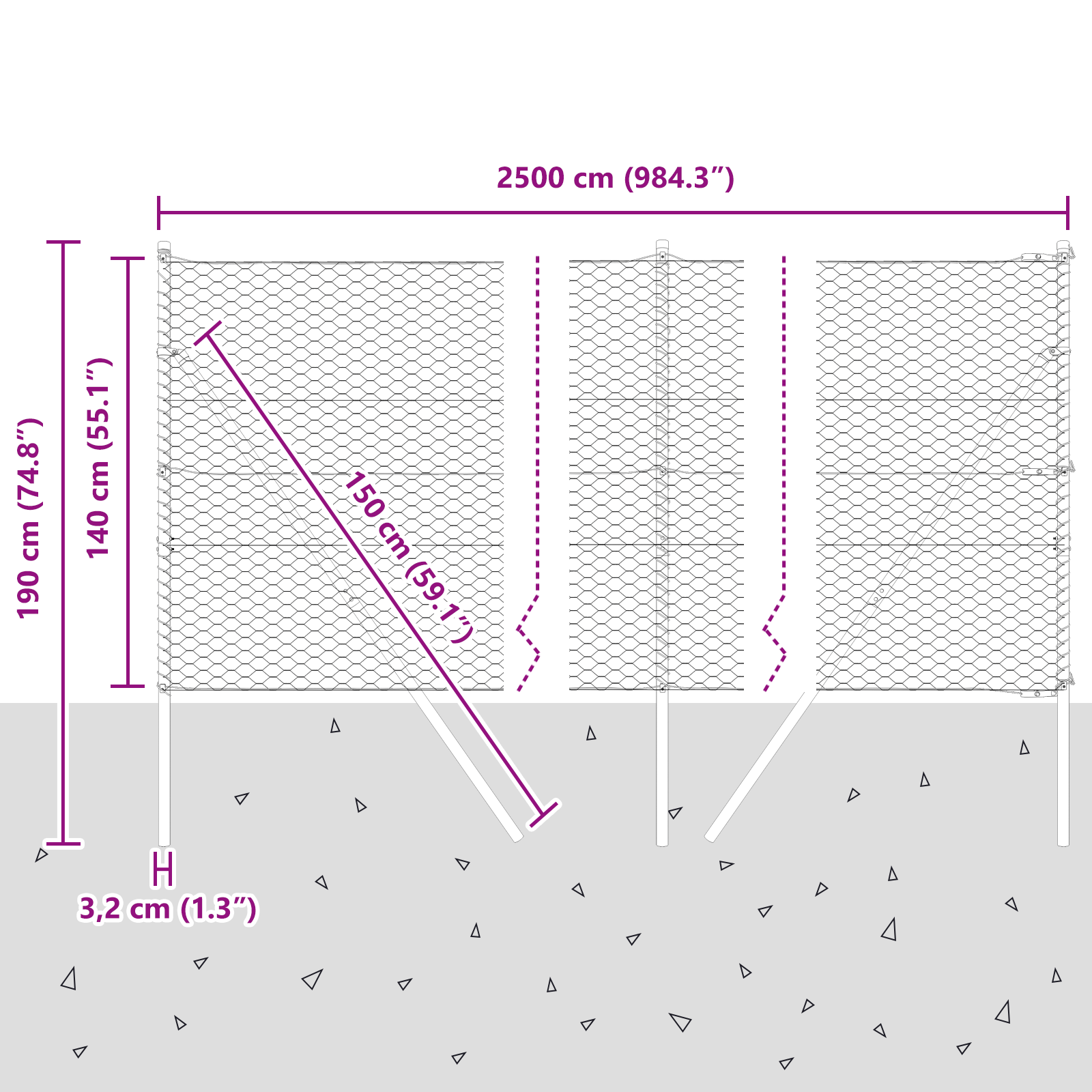 • Celkové rozměry: 2500 x 3,2 x 140 cm (D x Š x V)