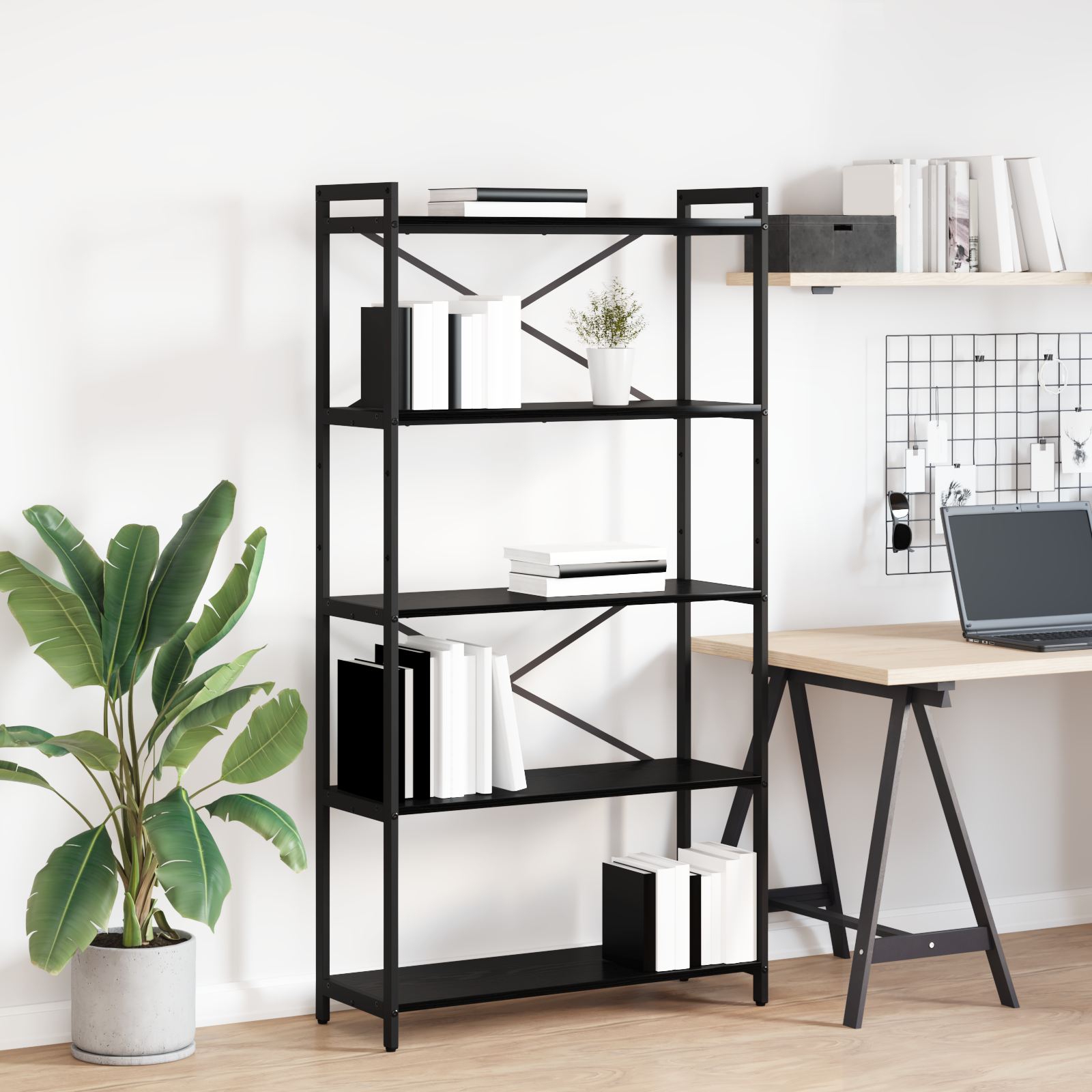 • Černý ocelový rám: Rám je vyroben z pevné oceli v elegantní černé, což zajišťuje jak sílu, tak estetiku. Robusní stavba unese váhu mnoha předmětů a zajišťuje stabilní a bezpečný přístup.