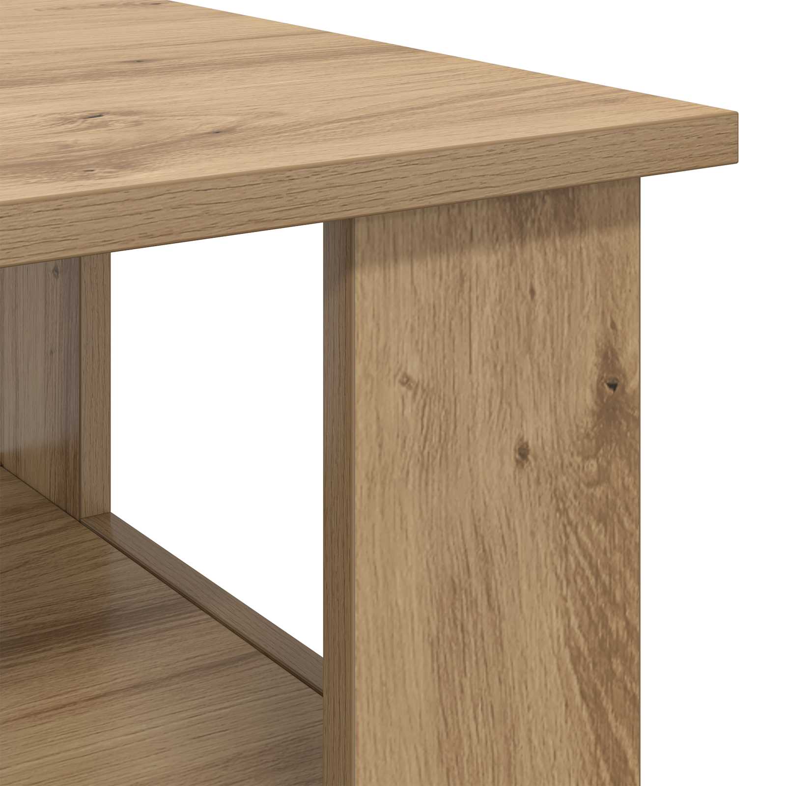 • Pevné policové desky: Pod desku stolu přidává úložné police z inženýrského dřeva, které vám poskytnou další místa na uložení. Tyhle police jsou skvělým pomocníkem pro organizaci časopisů, knih a dálkových ovladačů, a navíc pomáhají využít prostor v obýváku beze ztráty stylu.