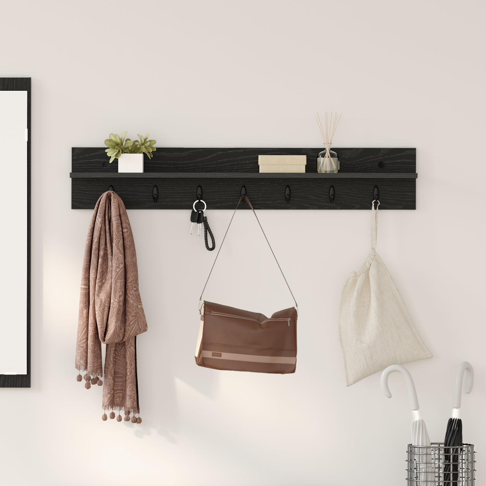 • Odolné háčky: Věšák má silné háčky, které bezpečně unesou různé předměty. Jsou rozmístěny tak, abyste měli co nejvíc místa na kabáty, šály a tašky, a tím se minimalizoval nepořádek. Jejich robustní konstrukce zajistí, že vše zůstane na svém místě.
