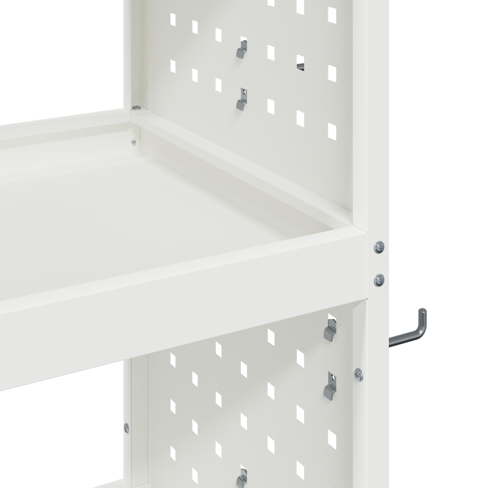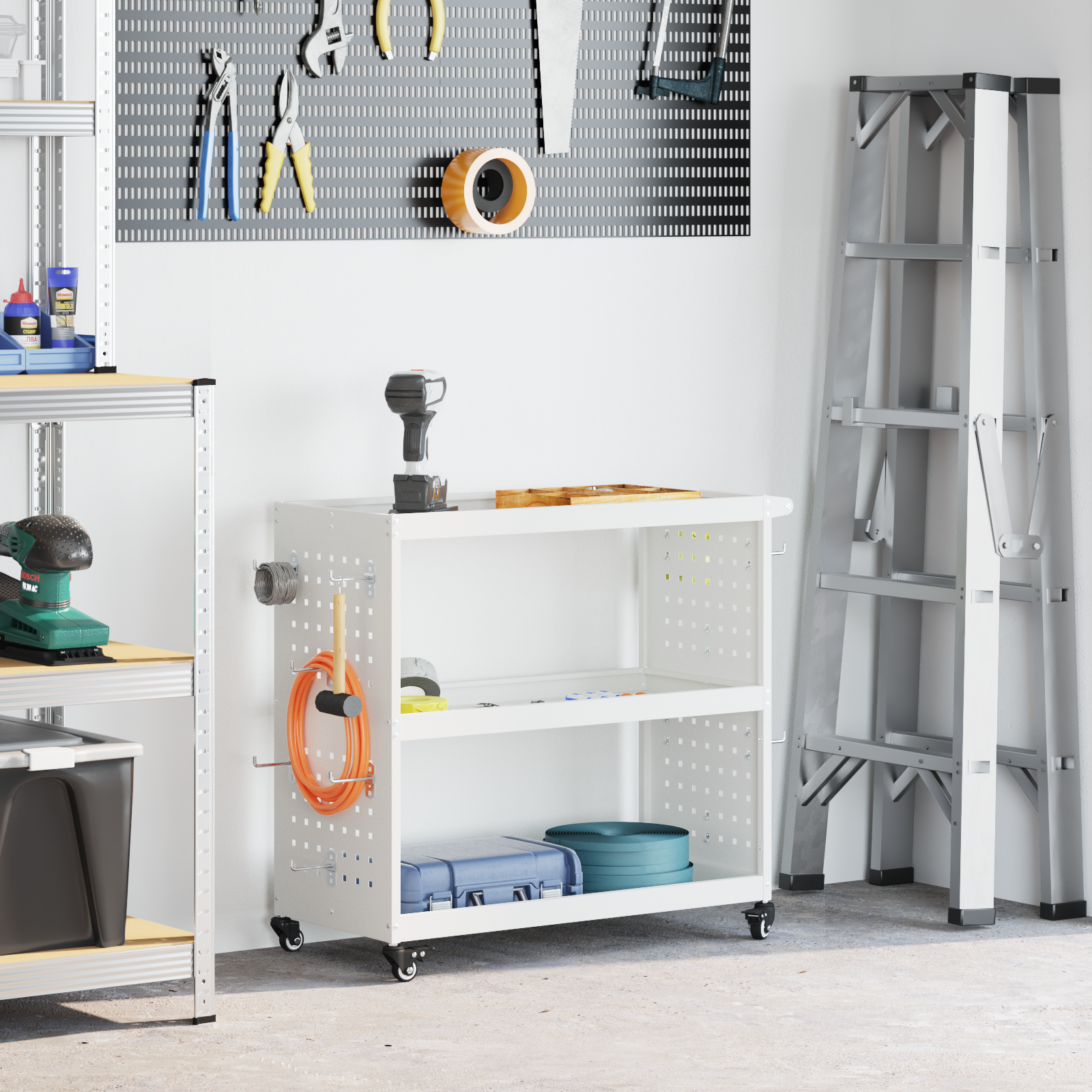 • Multifunkční police Má kovové police, ideální pro organizaci různých nástrojů a doplňků. Efektivně využívají prostor, což ti pomůže lépe pracovat.